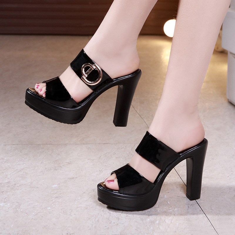 漆皮防水台高跟粗跟拖鞋女2020夏时尚松糕厚底外穿鱼嘴拖鞋大码