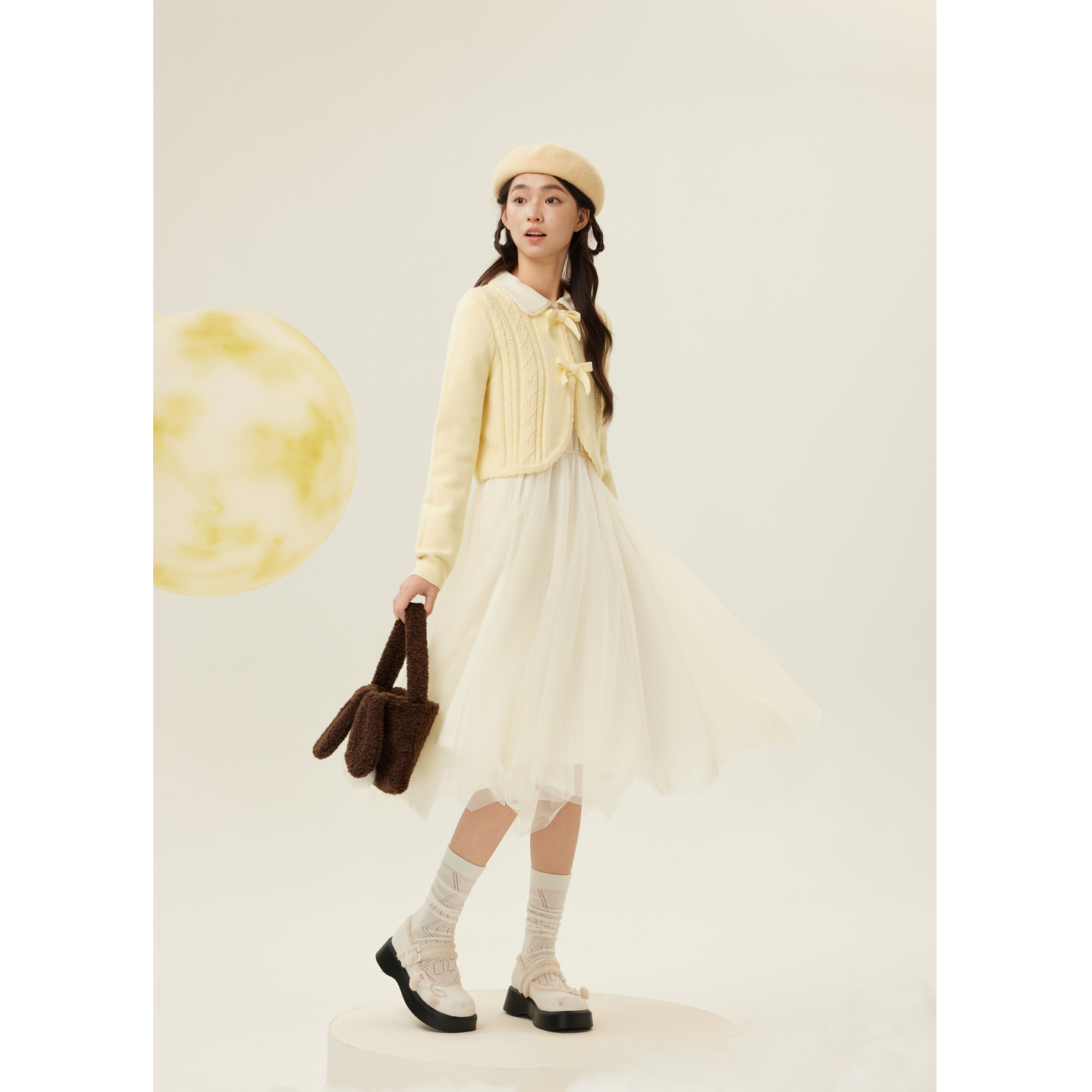 紫涵翻领收腰网纱连衣裙短款针织开衫两件套装裙女2025年冬季新款