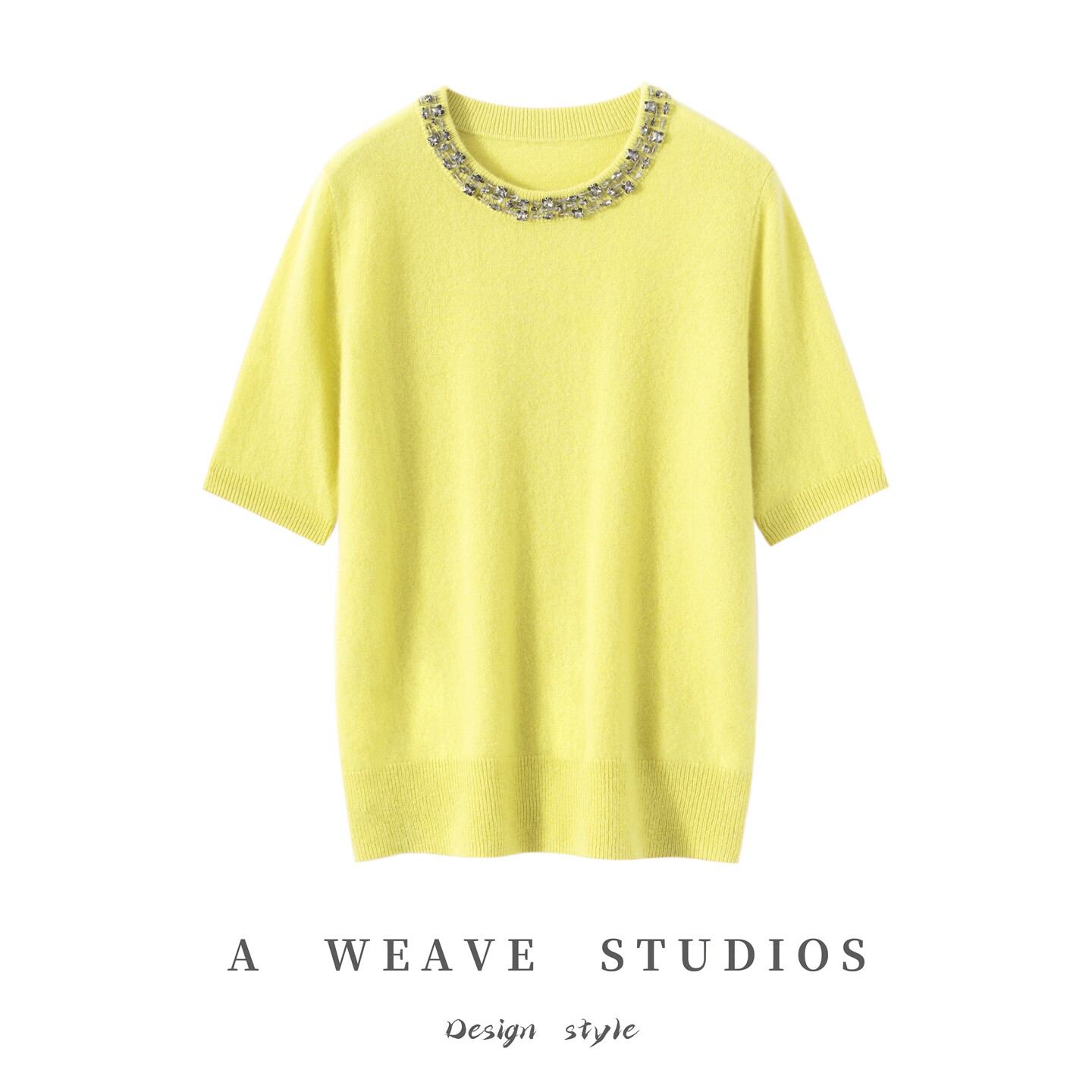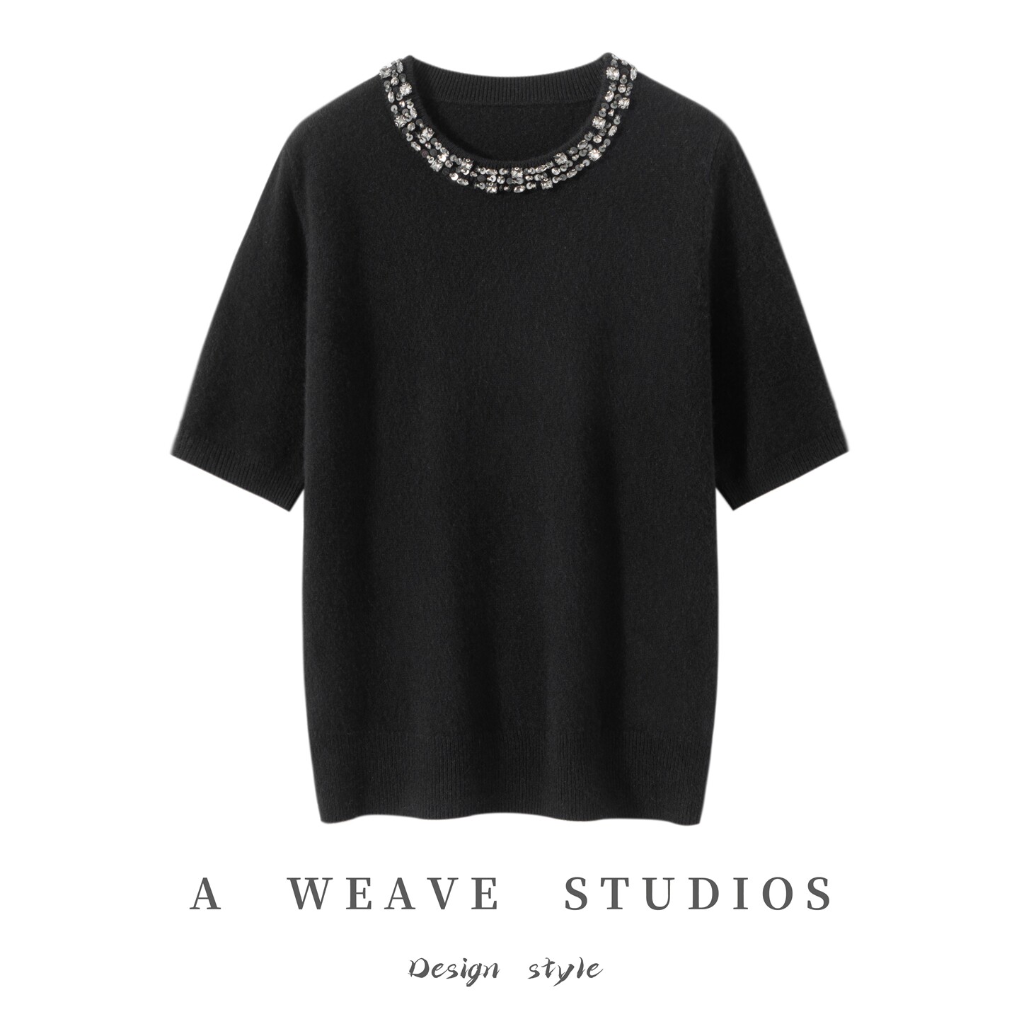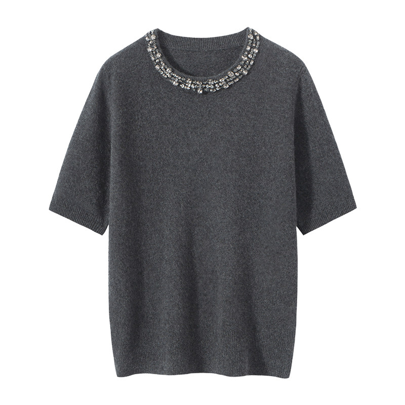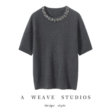 2025秋冬新款100%纯山羊绒女圆领针织短袖领口带钻纯色套头打底衫