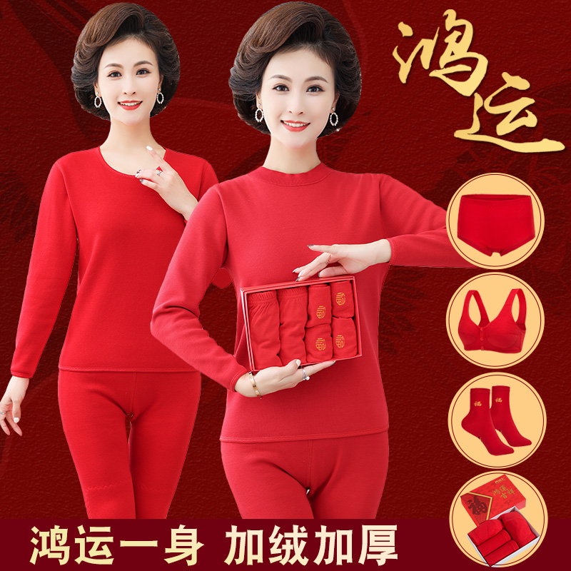 红色本命年内衣套装女妈妈文胸保暖女士加绒加厚中老年人秋衣秋裤