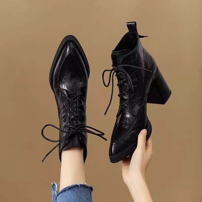 巨显腿长~小个子厚底增高尖头英伦高跟马丁靴女系带粗跟百搭短靴