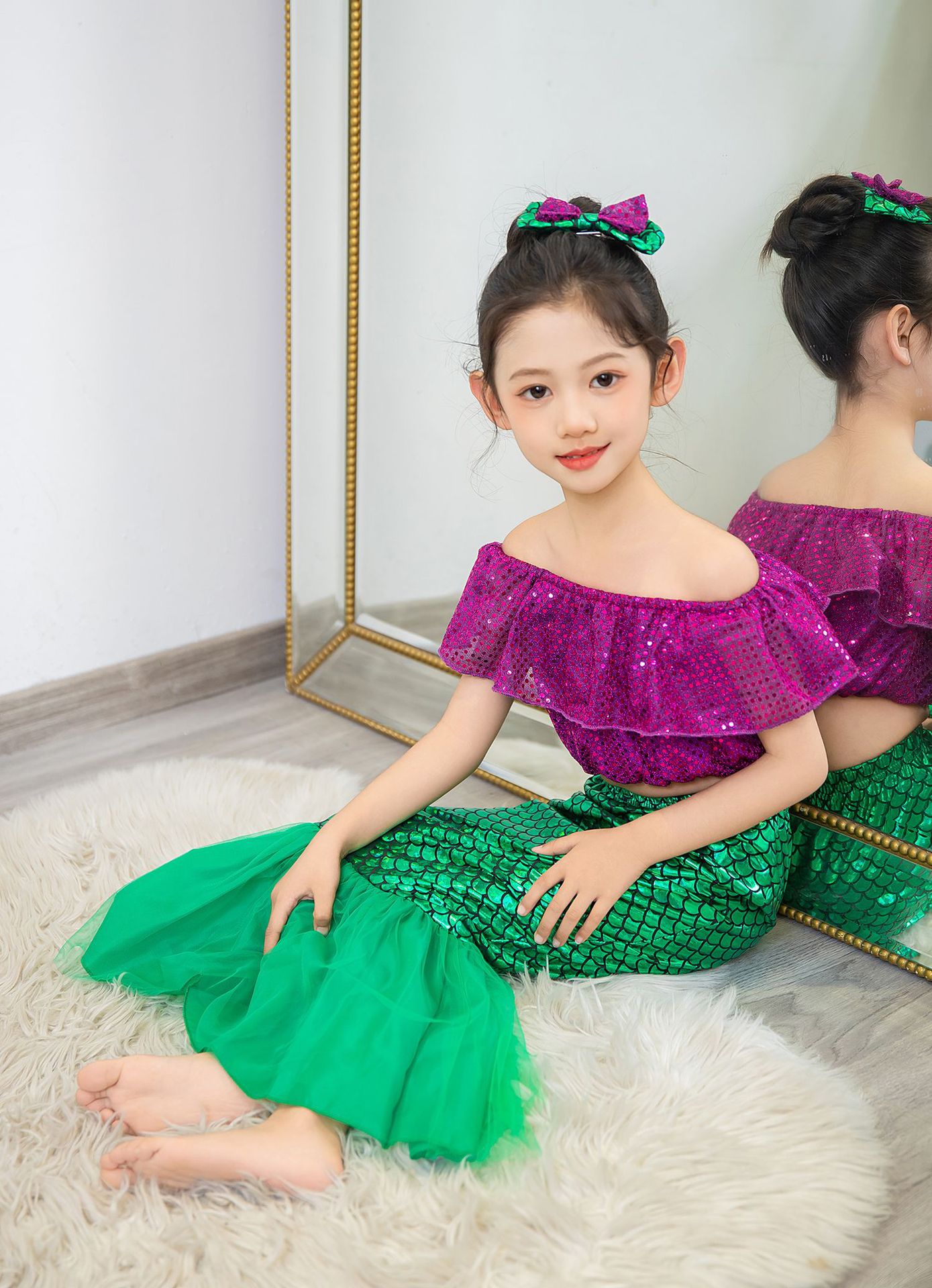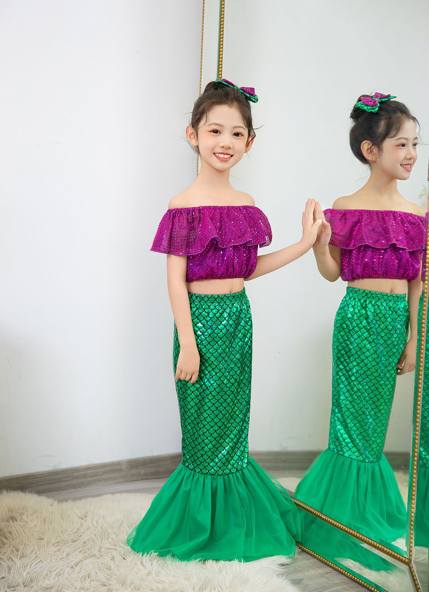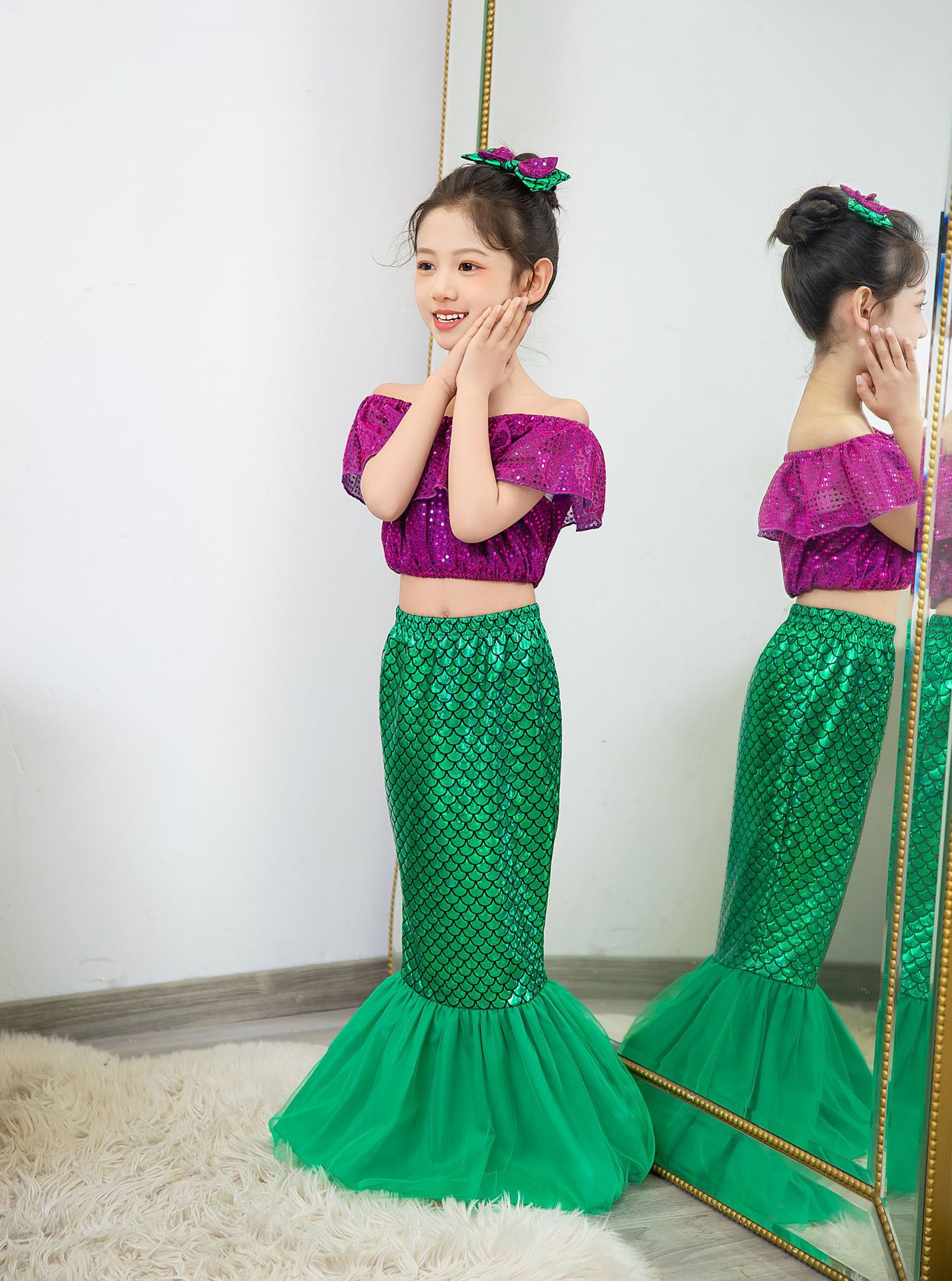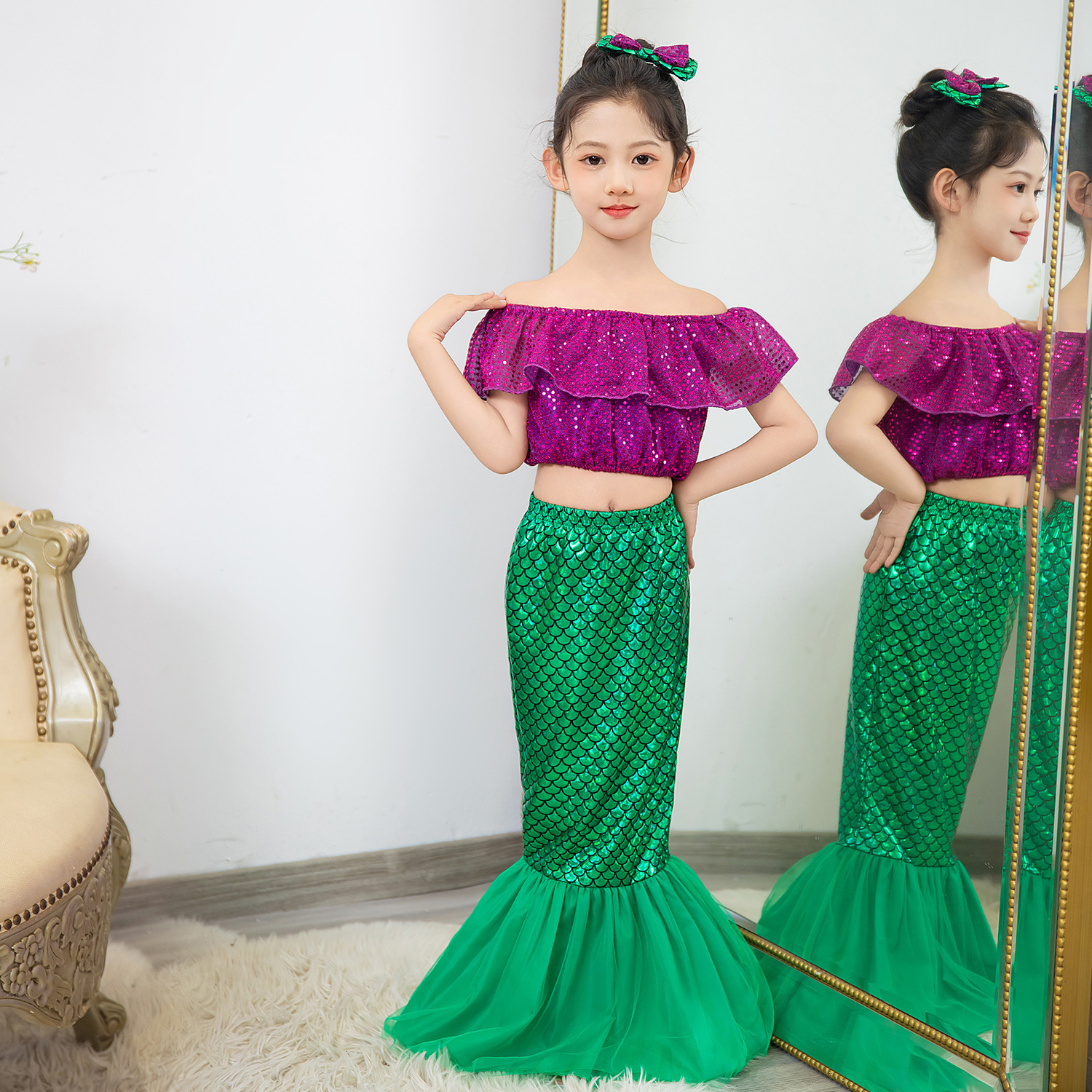 女童一字肩美人鱼连衣裙儿童生日可爱甜美鱼尾套装裙分体游泳衣夏