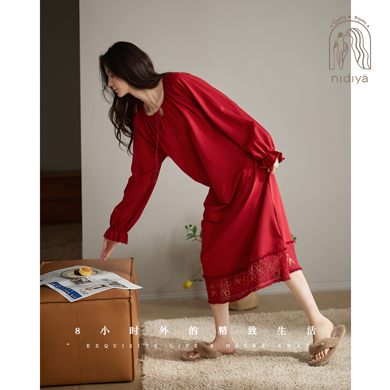 妮狄娅睡衣睡裙女秋季长袖柔软棉中长裙本命年红色春秋甜美家居服