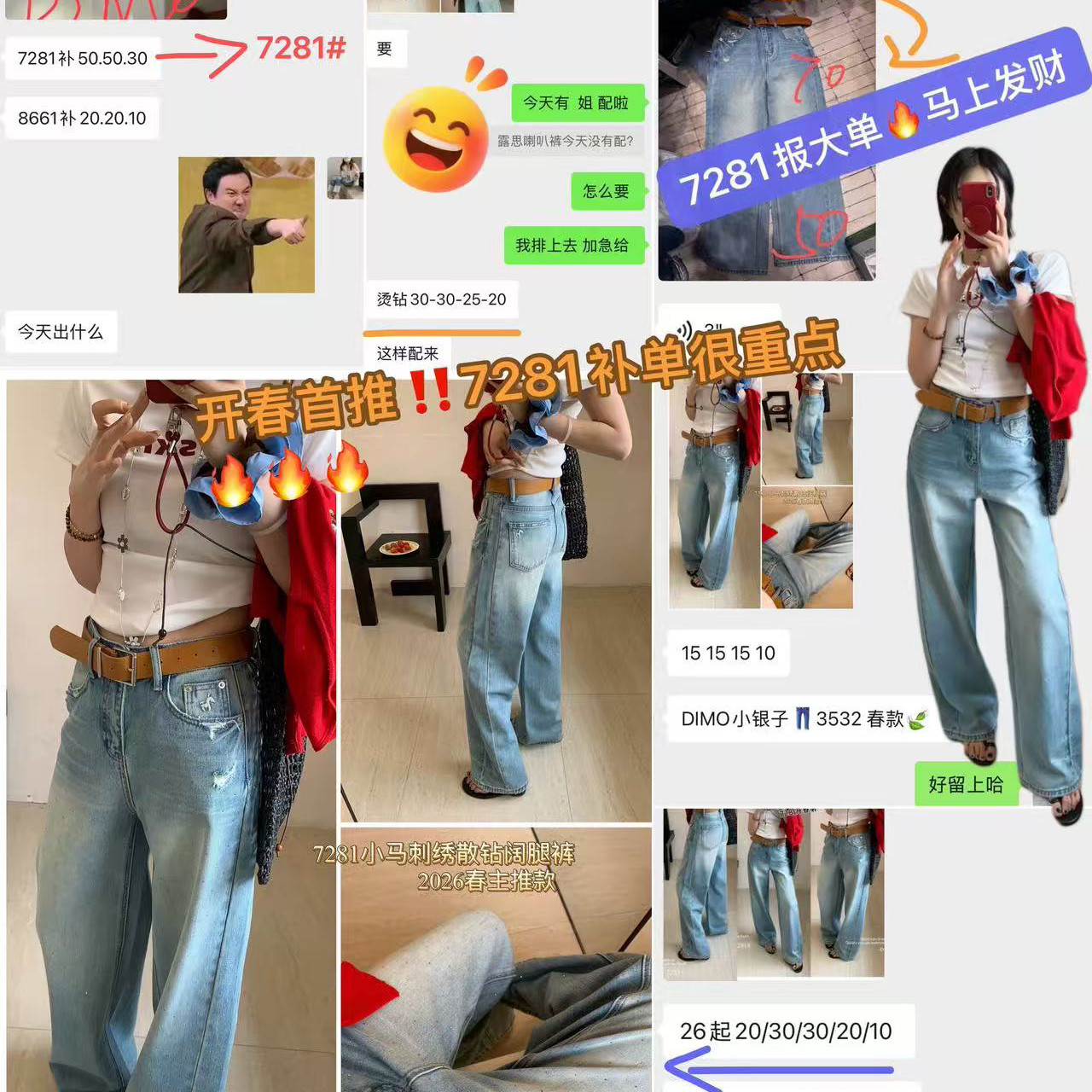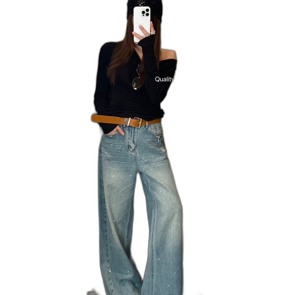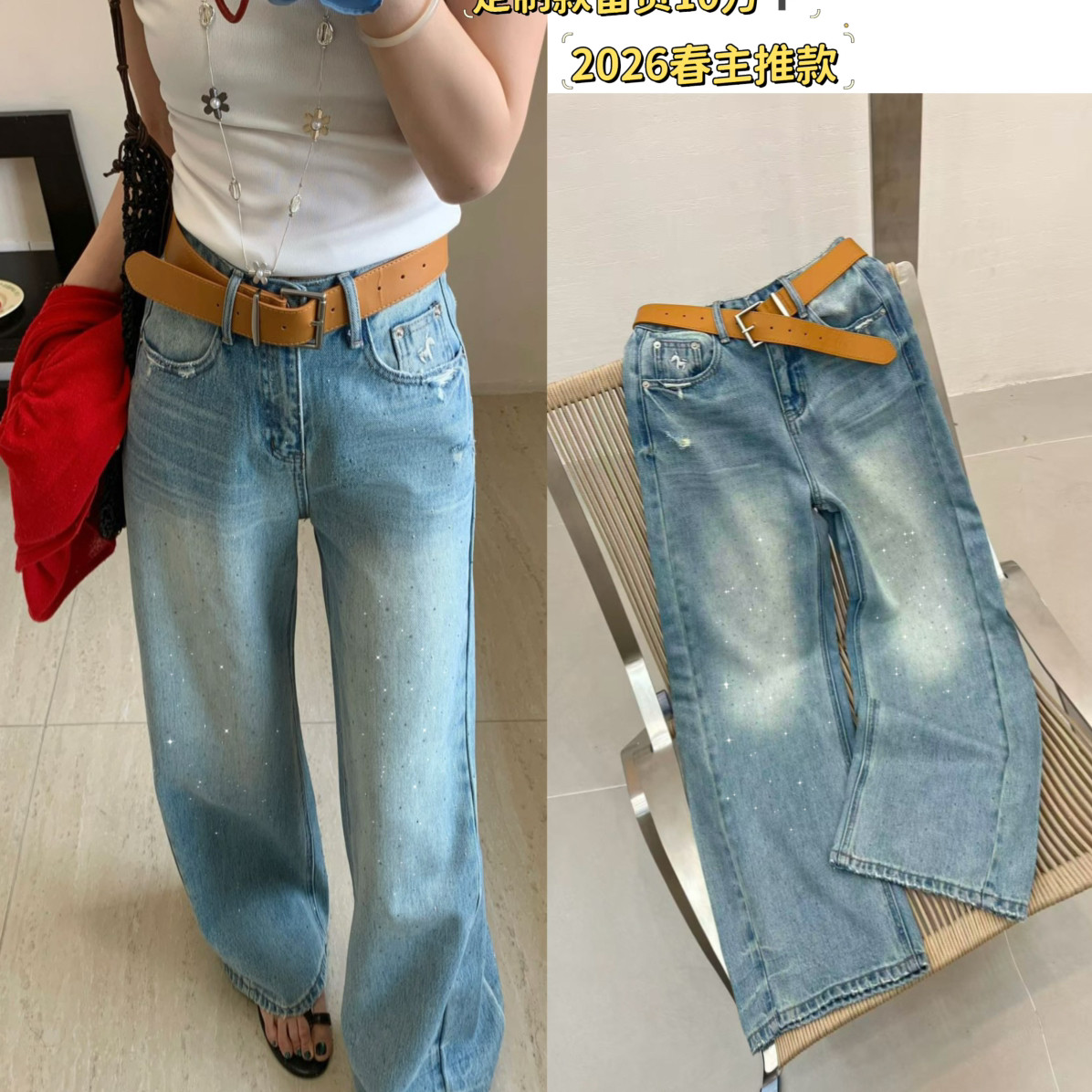 DIMO-马刺绣精致阔腿裤牛仔裤(配腰带)(时髦设计美式复古)7281兰