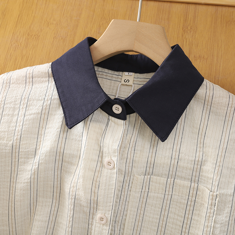 棉麻竖条纹衬衫女春秋设计感小众时尚撞色衬衣通勤百搭打底上衣潮