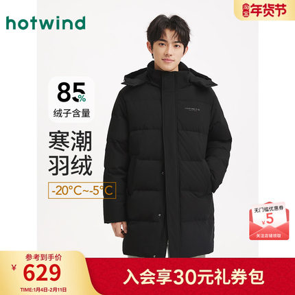 热风男士羽绒服2025年冬季新款休闲中长羽绒服连帽保暖黑色羽绒服