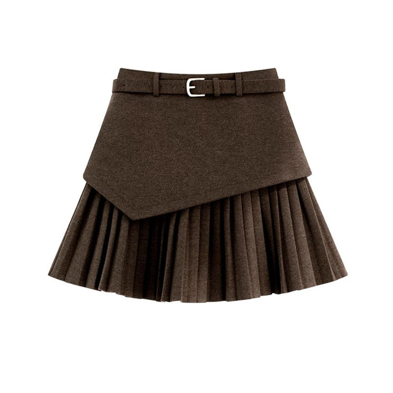 复古毛呢半身裙女冬季新款时尚拼接假两件百褶裙包臀高腰a字短裙