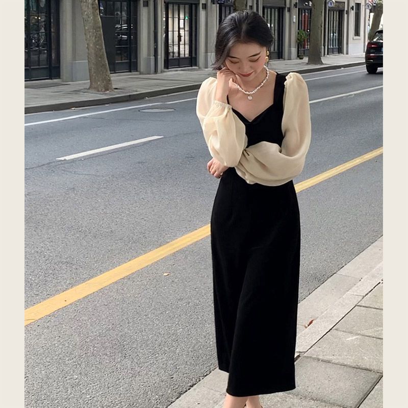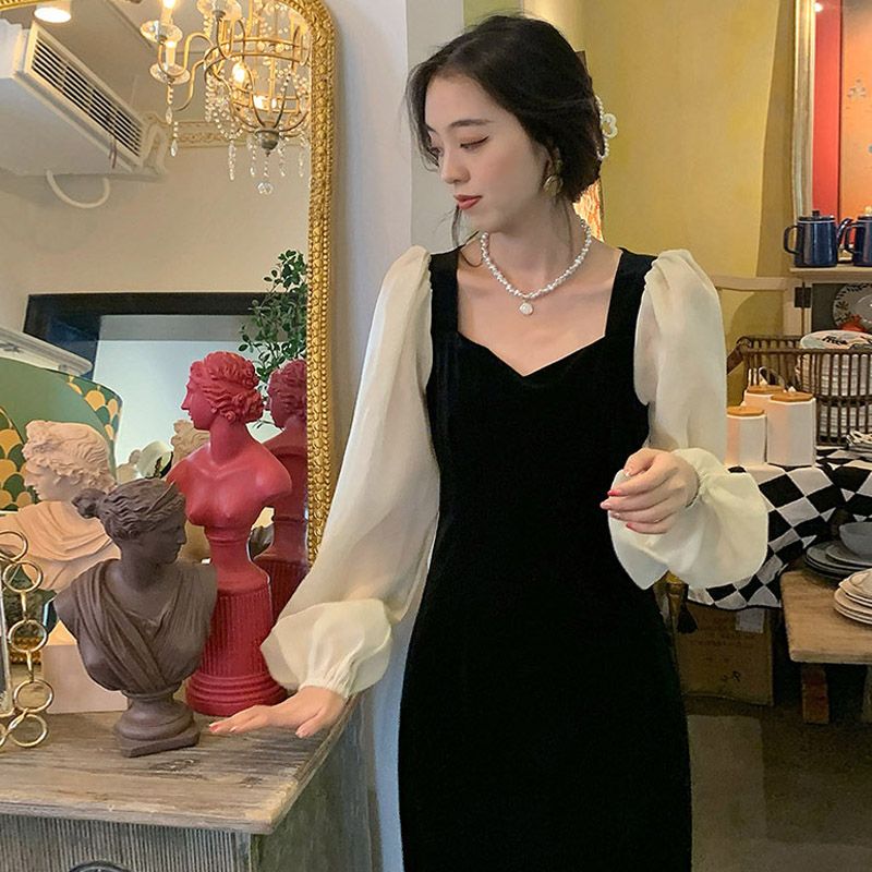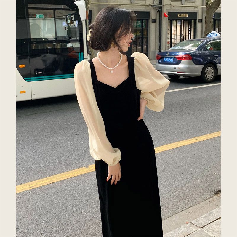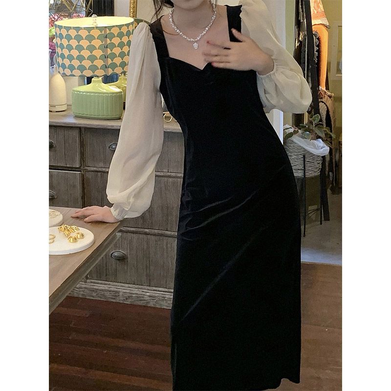 赫本风小黑裙女秋冬法式复古灯笼袖中长款高腰显瘦方领丝绒连衣裙