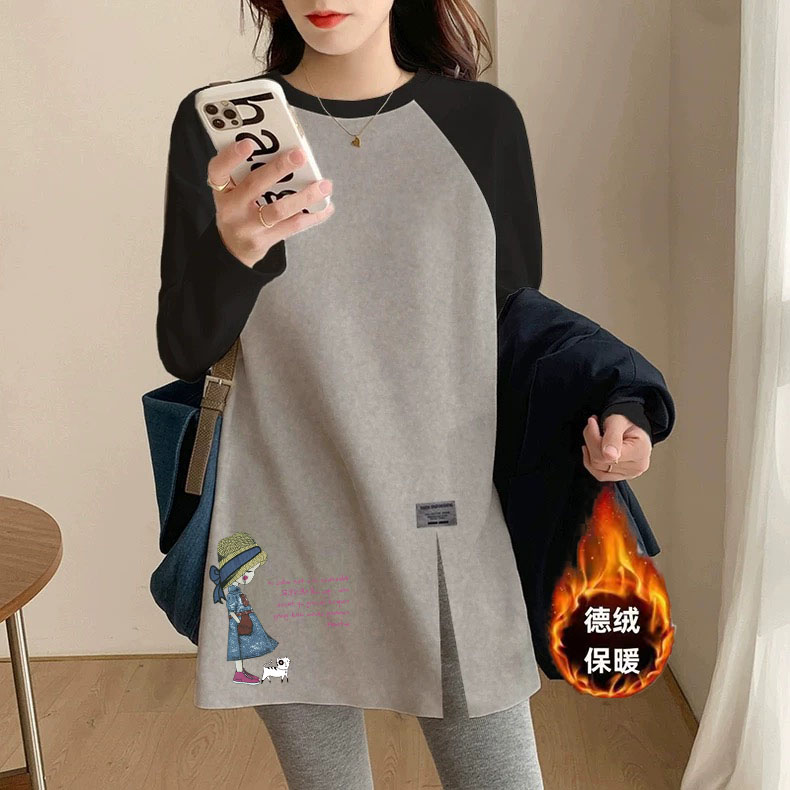 德绒插肩拼色2025女秋冬季新款长袖中长款t恤上衣韩版开叉打底衫