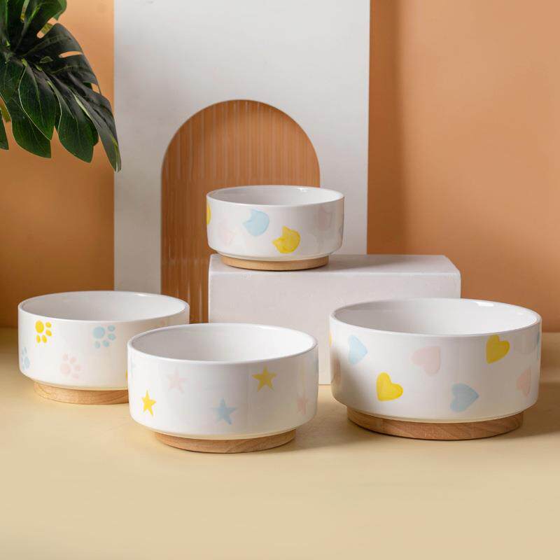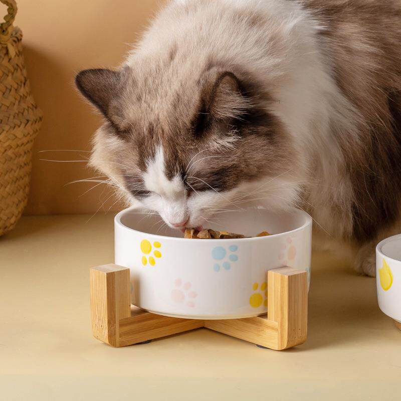 猫碗陶瓷猫咪水碗粮碗保护颈椎防滑木架高脚狗碗饮水碗黑色宠物碗