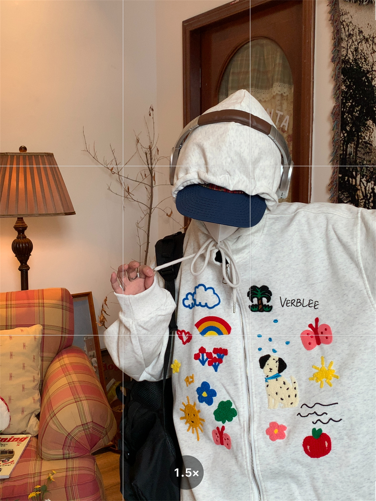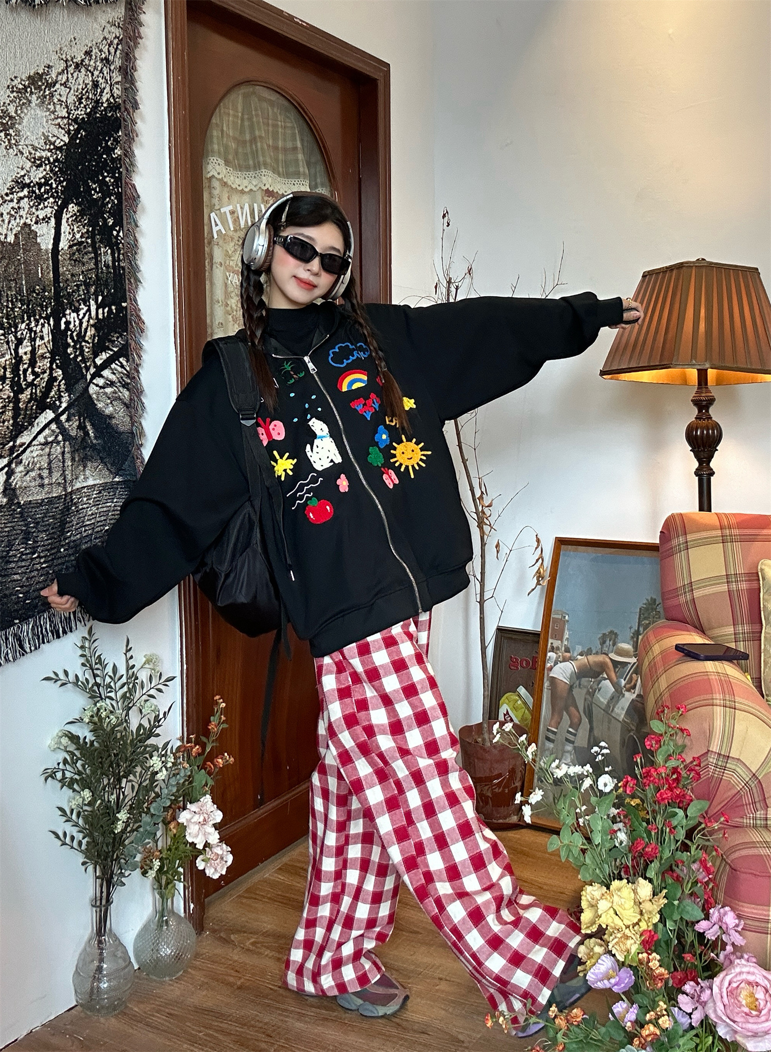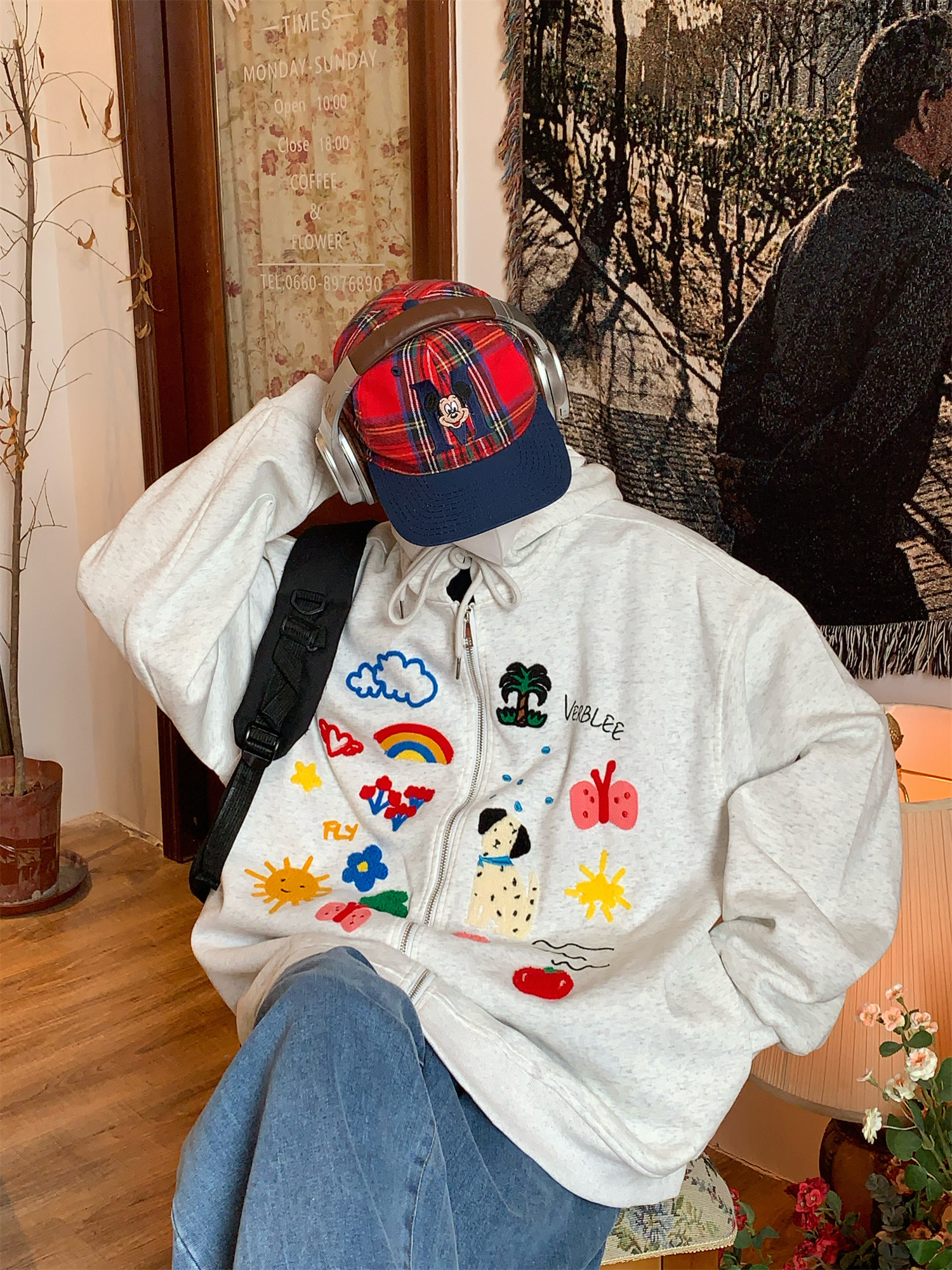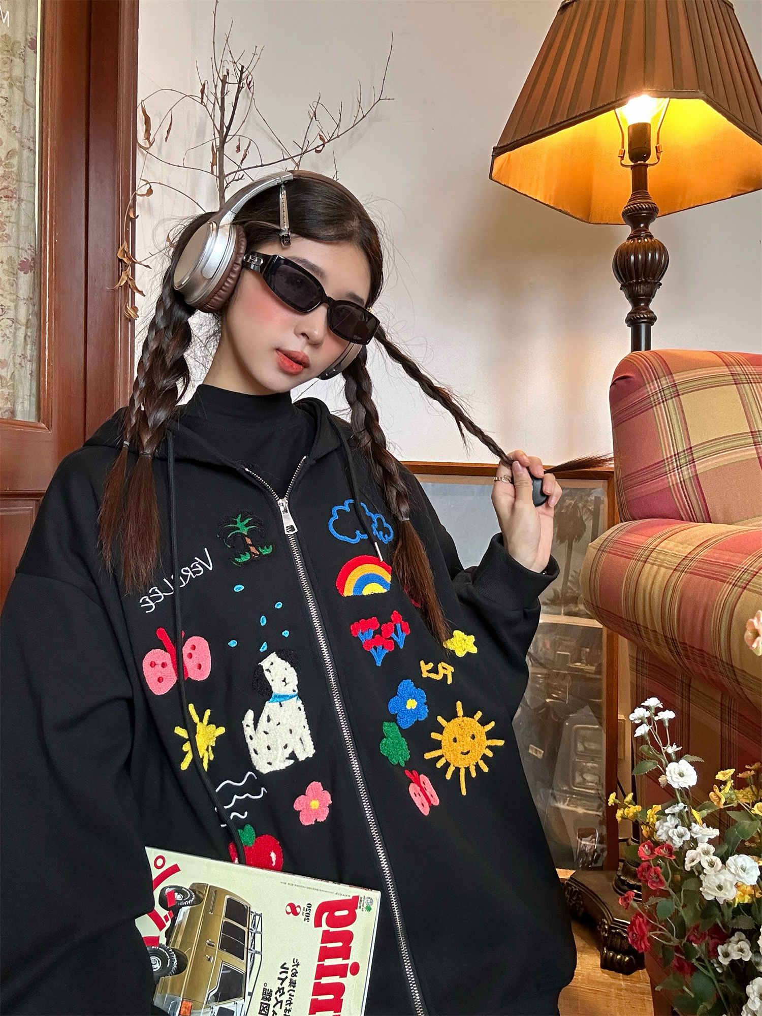 C2自制/美式复古卡通毛巾绣拉链外套女2025秋季休闲宽松卫衣衫潮