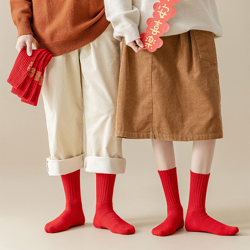 踩地小人图案纯棉毛圈加厚中筒袜子大红色男女蛇年本命年秋冬保暖