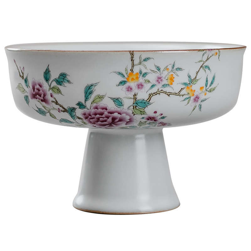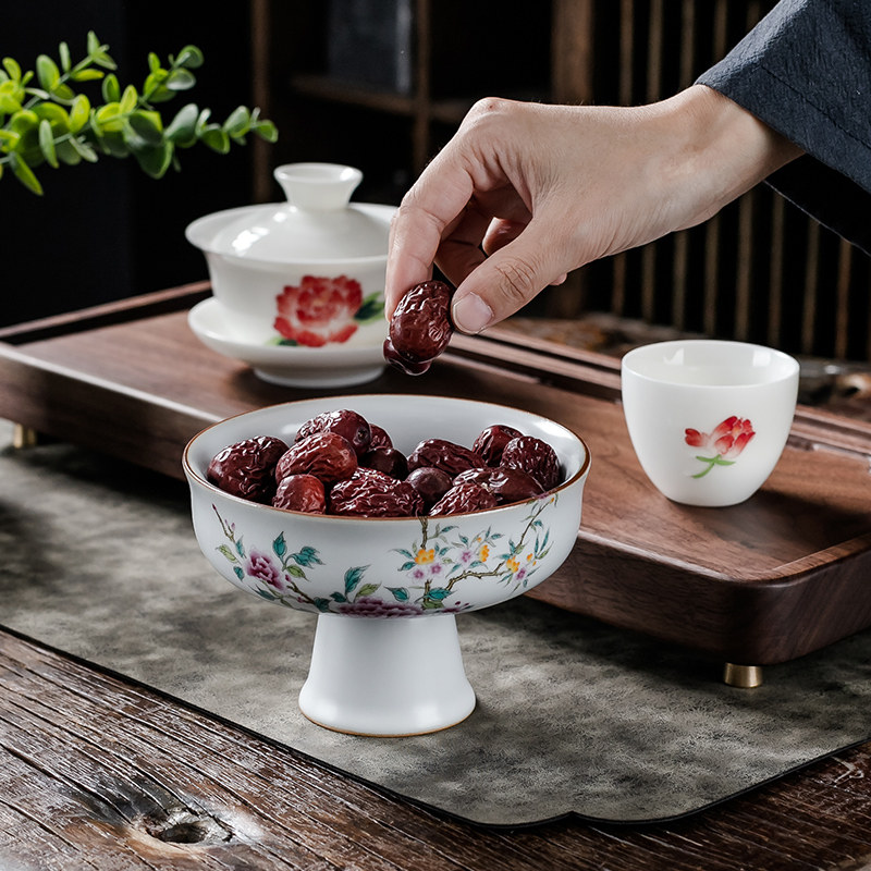 汝窑茶点盘高足果碗点心盘水果零食盘陶瓷高脚果盘中式糕点盘托盘
