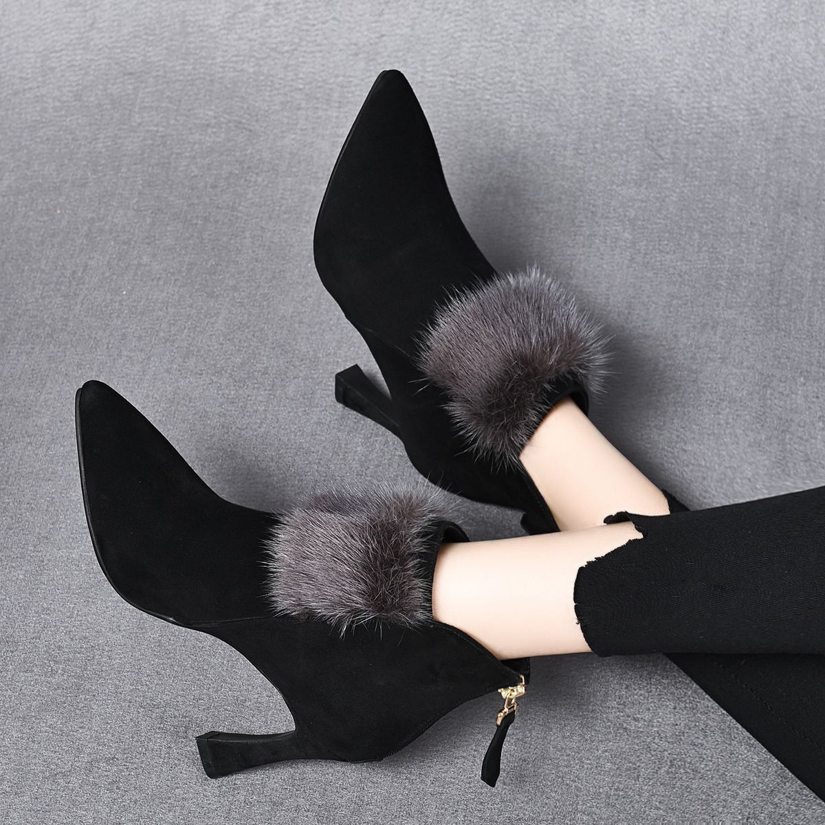 真皮尖头细跟小短靴女2025秋冬新款高跟软底水貂毛磨砂羊皮加绒女
