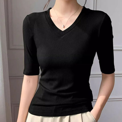 纯棉短袖T恤女2025新款春秋薄款简约黑色时尚V领五分袖打底衫上衣