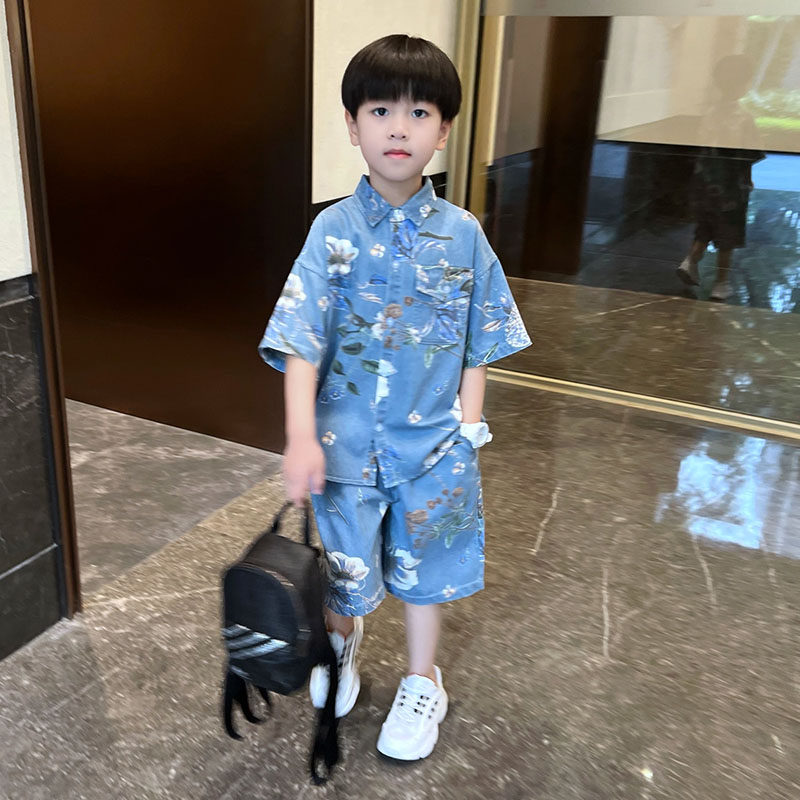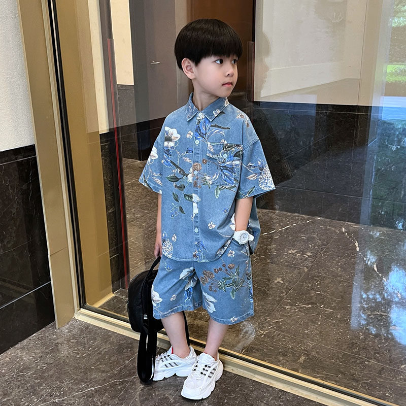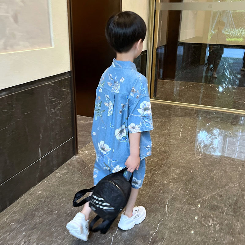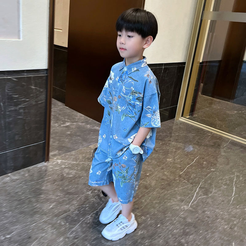 男童夏季薄款牛仔套装2025新款儿童中大童休闲短袖衬衫短裤两件套