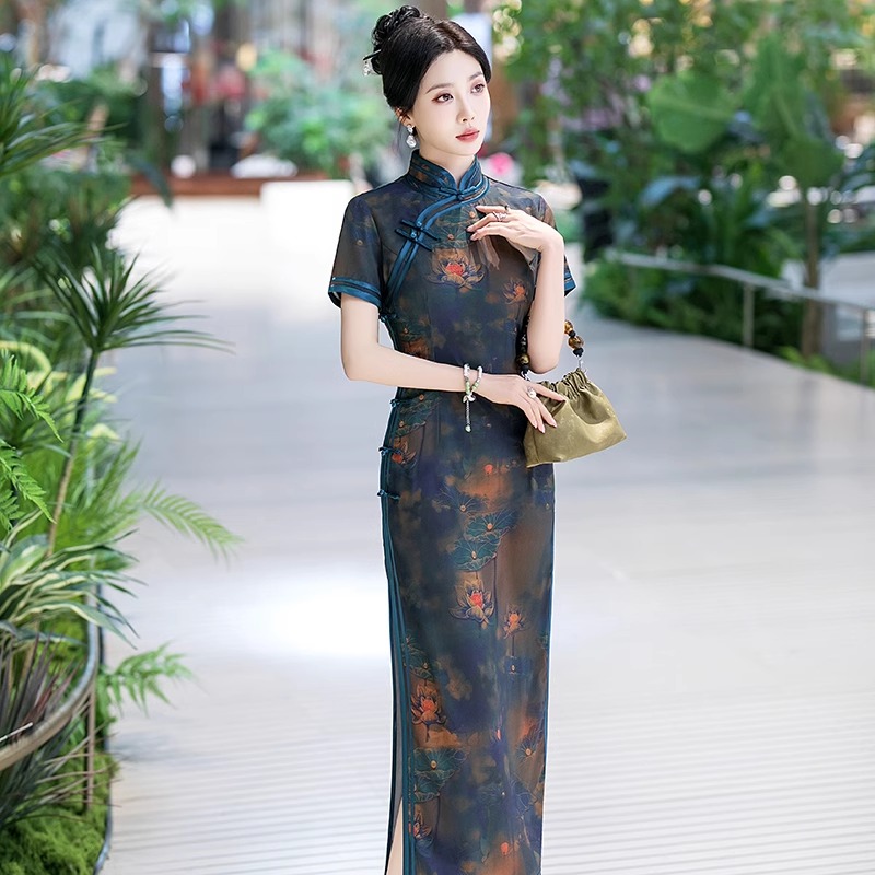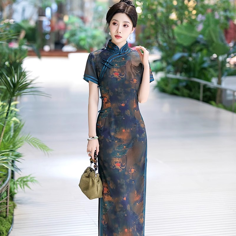 高端品牌长款妈妈真丝旗袍日常优雅气质显瘦复古印花桑蚕丝长裙夏
