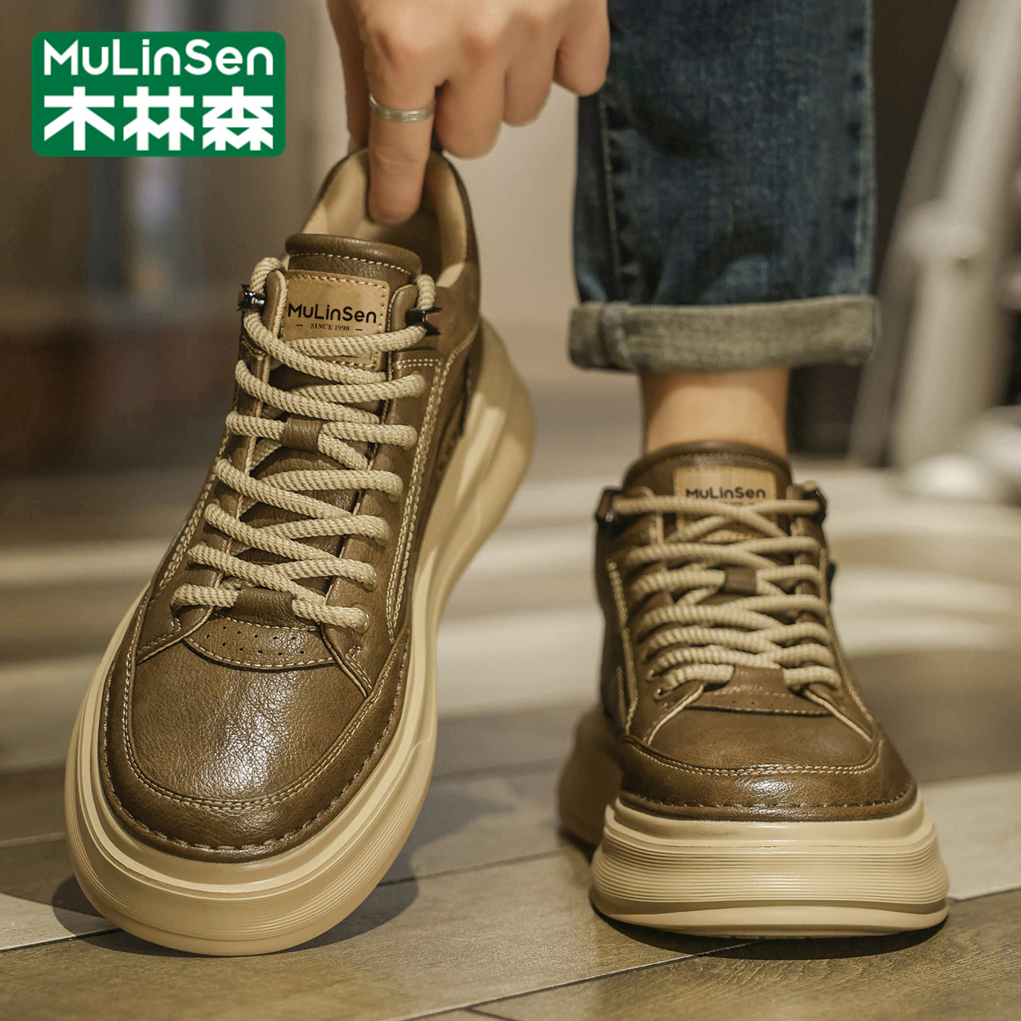 木林森男鞋冬季运动休闲英伦复古板鞋中高帮工装马丁厚底皮鞋短靴