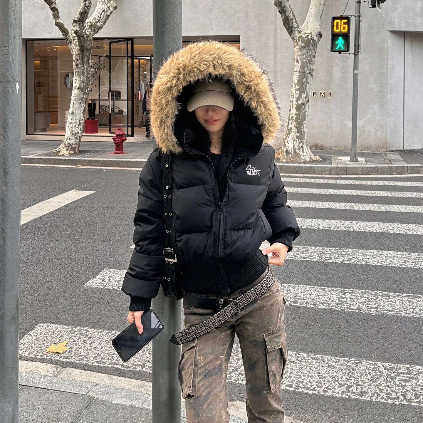 黑色连帽毛毛领长袖开衫棉服气质ins风加厚拉链款外套短款上衣女