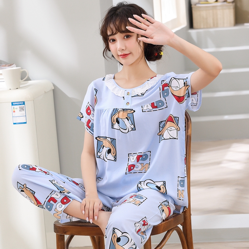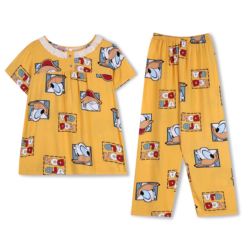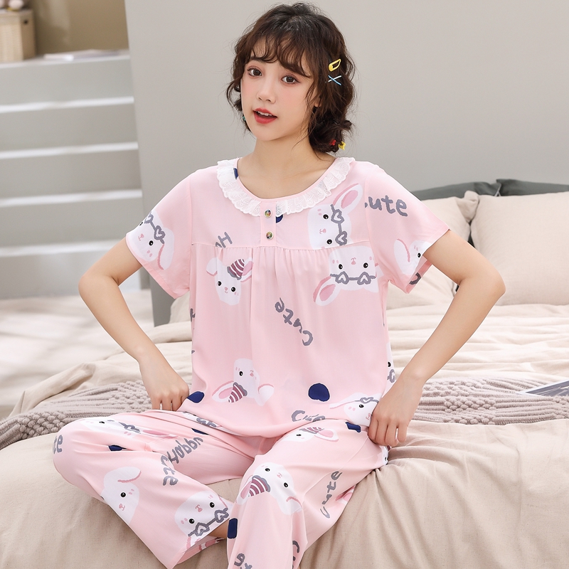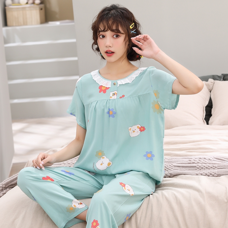 棉绸睡衣女春夏季短袖套装人造棉宽松薄款可爱卡通大码绵绸家居服