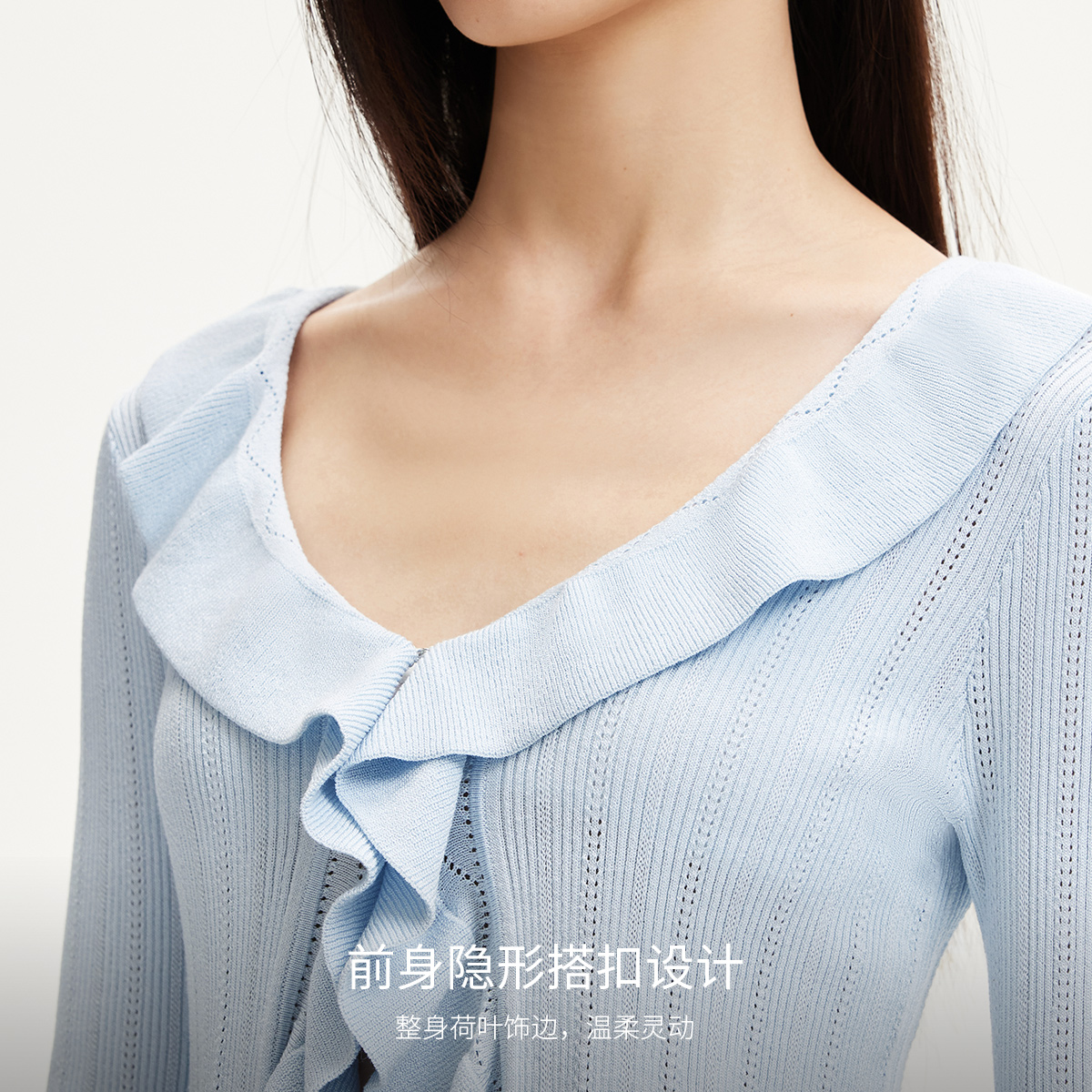 绫致Vero Moda针织衫女25春夏亮丝荷叶边镂空针织开衫简约