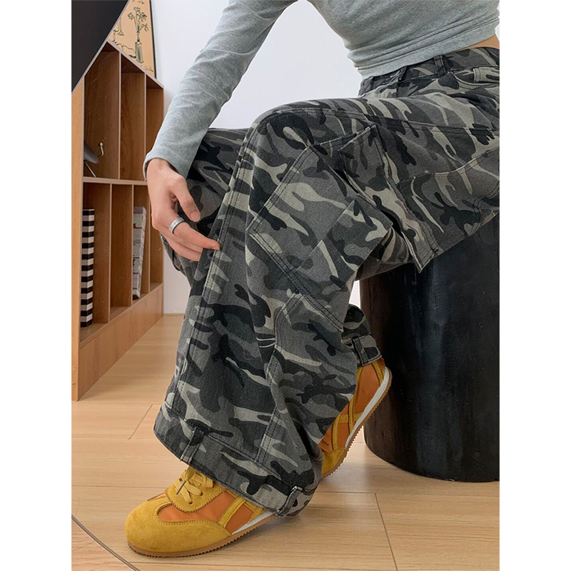 美式高个子迷彩工装廓形牛仔裤女秋冬新款水洗宽松显瘦阔腿裤子潮