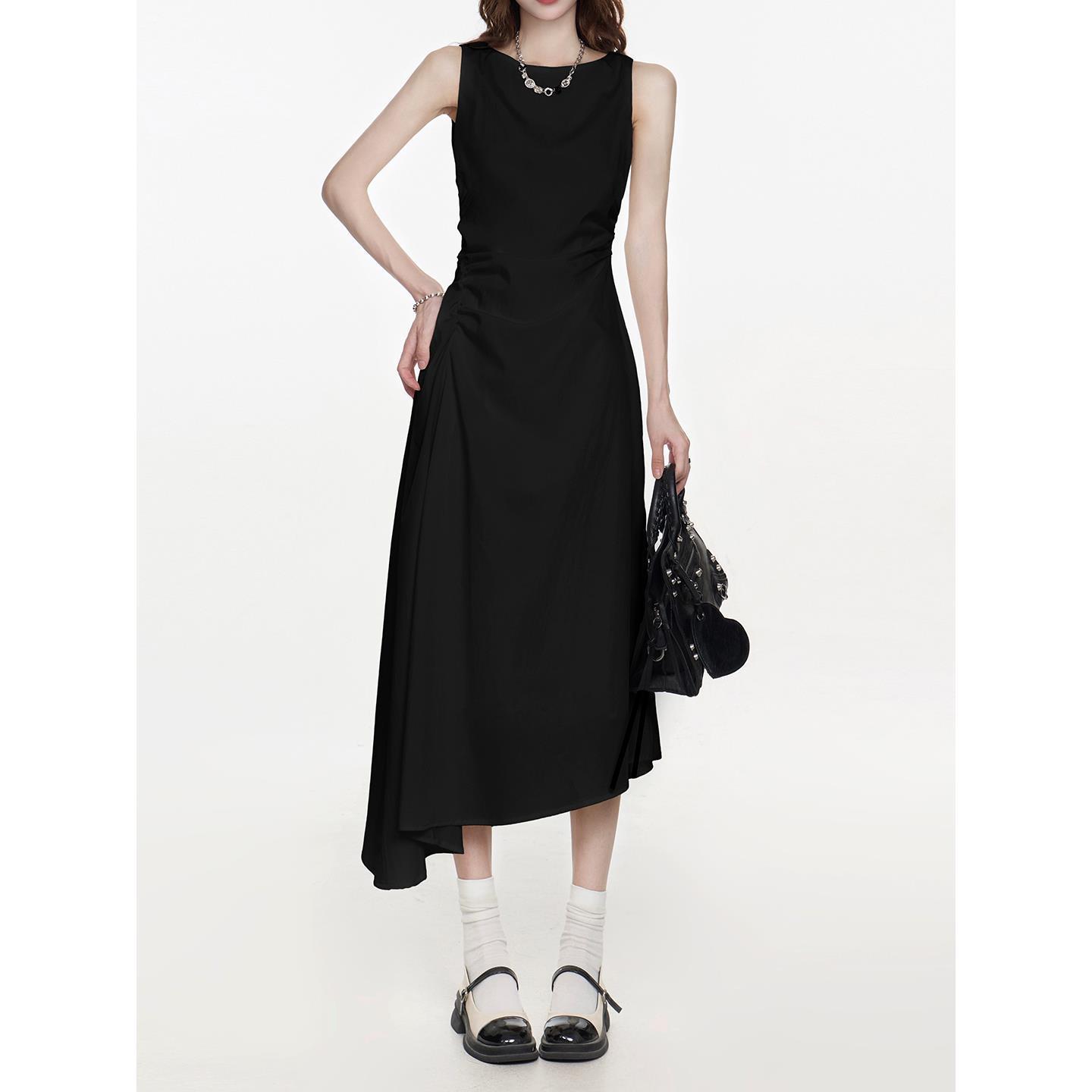 黑色法式无袖连衣裙女2025夏季小个子设计感不规则裙摆背心长裙