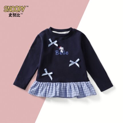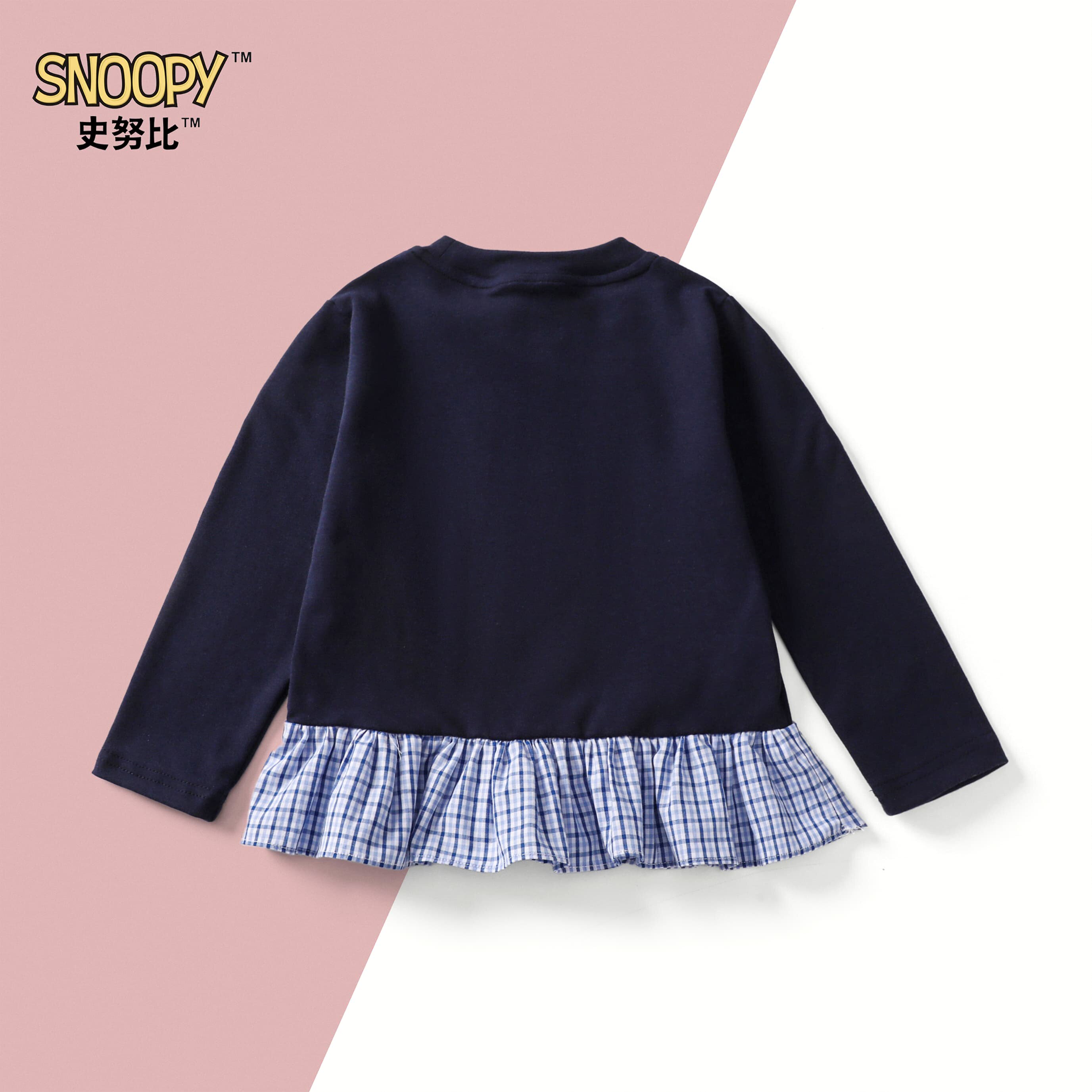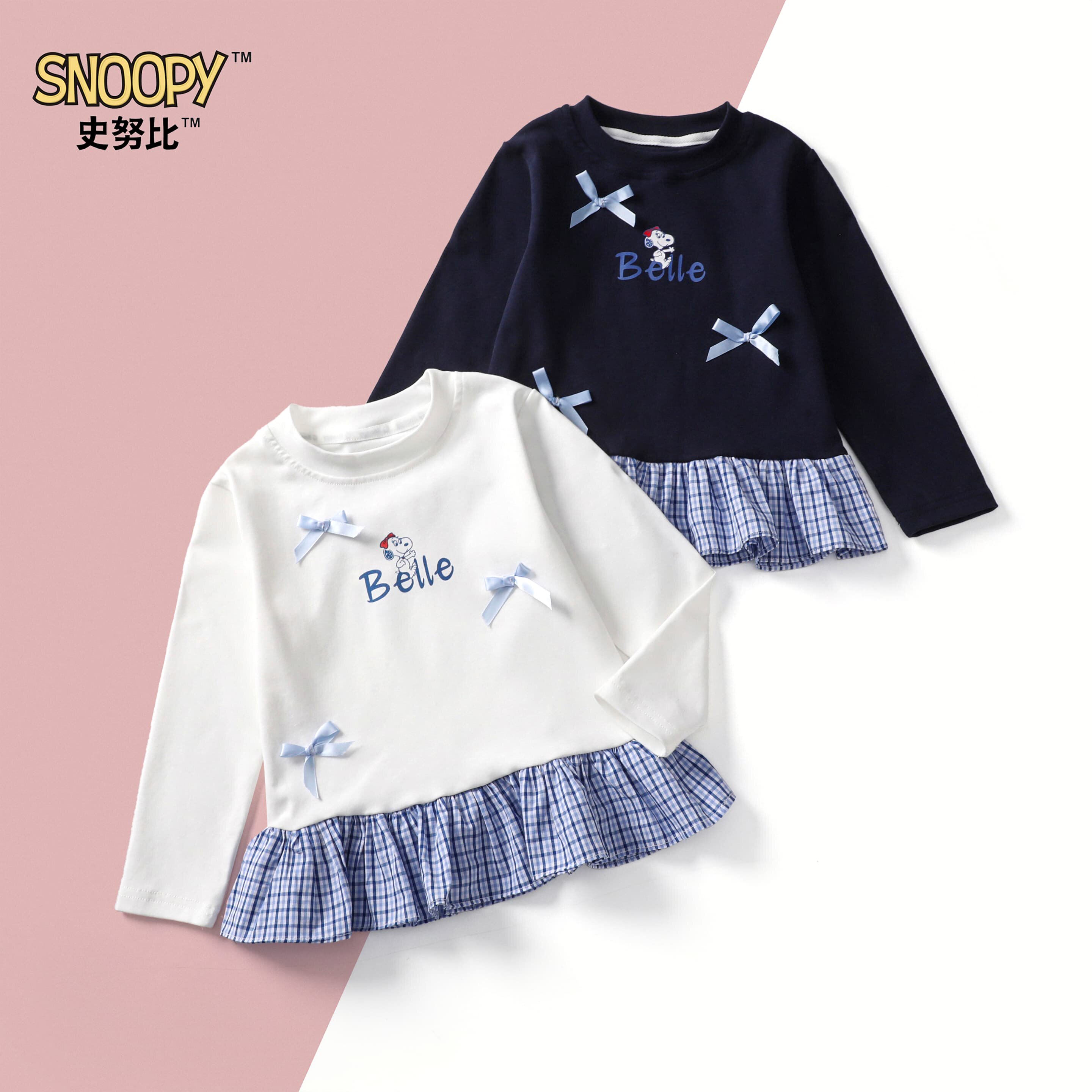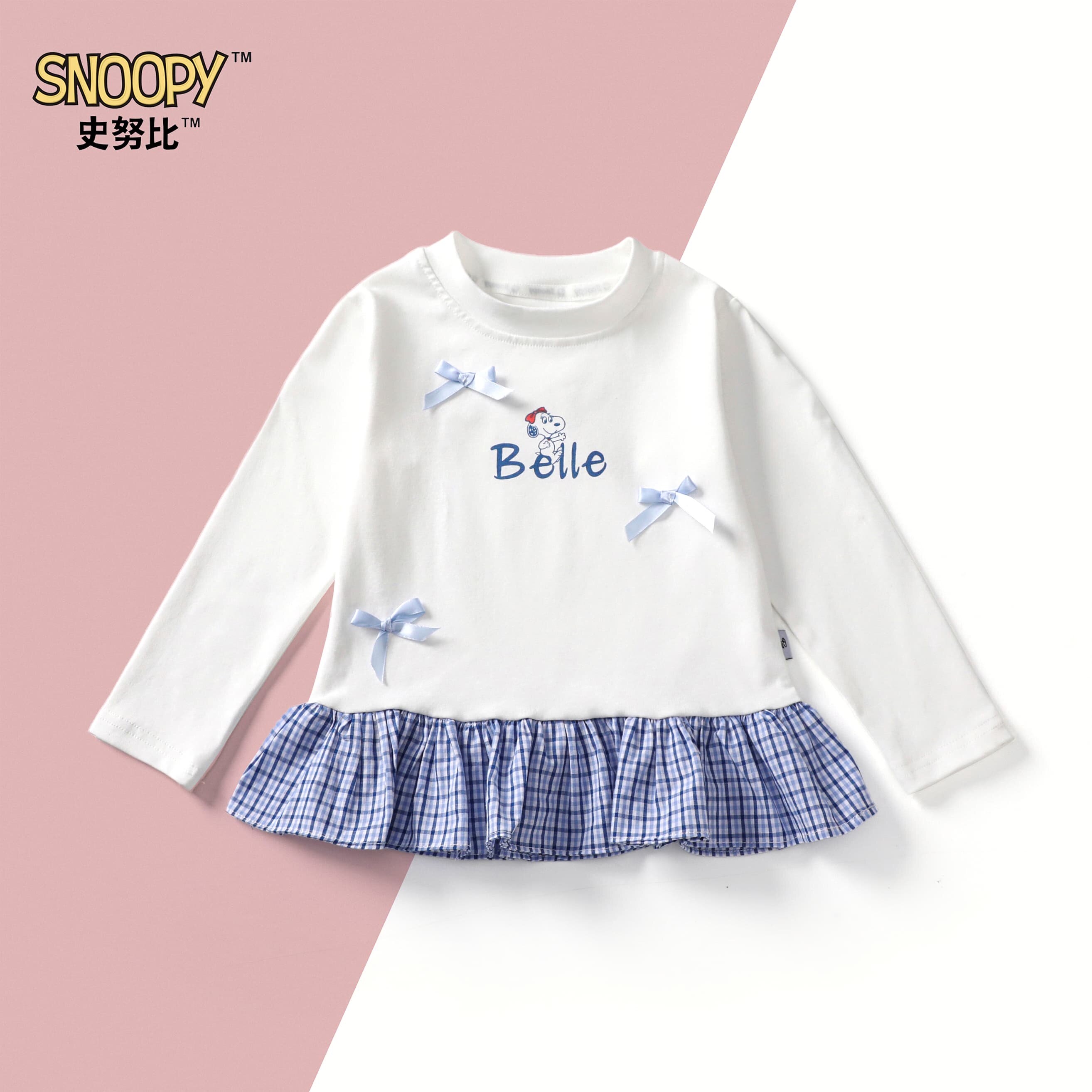 史努比童装女童宝宝可爱韩版格纹拼接蓝格T恤长袖上衣
