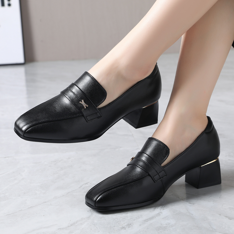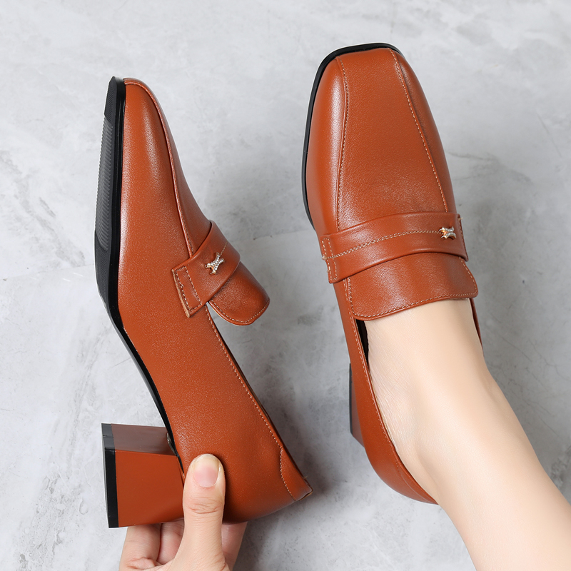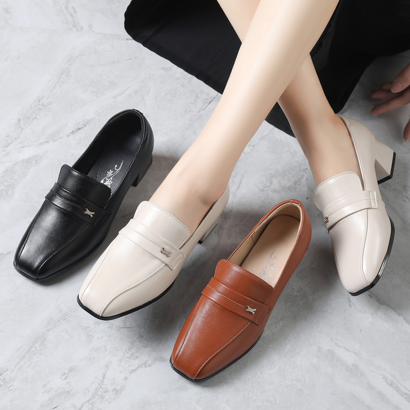 真皮粗跟单鞋百搭方头软底乐福鞋