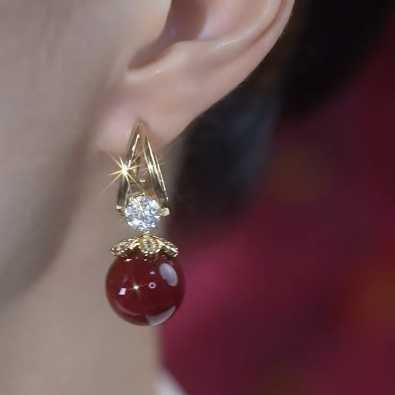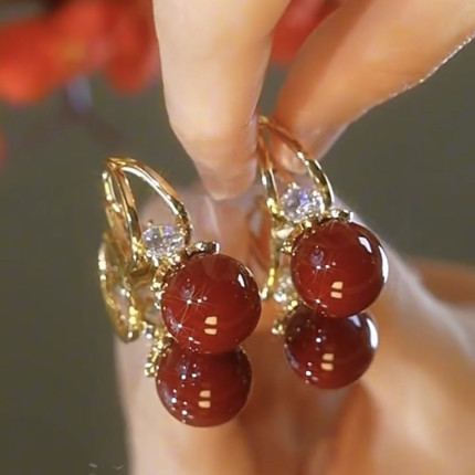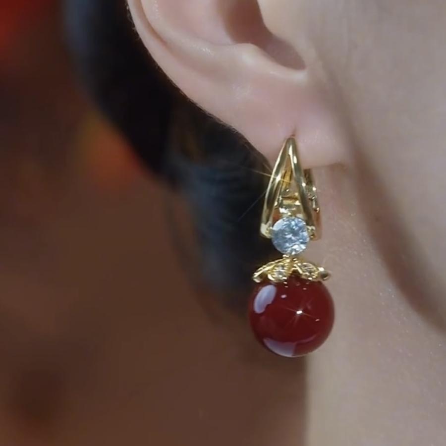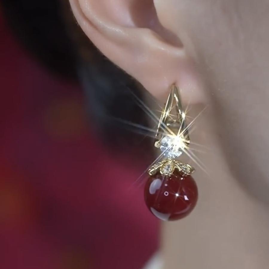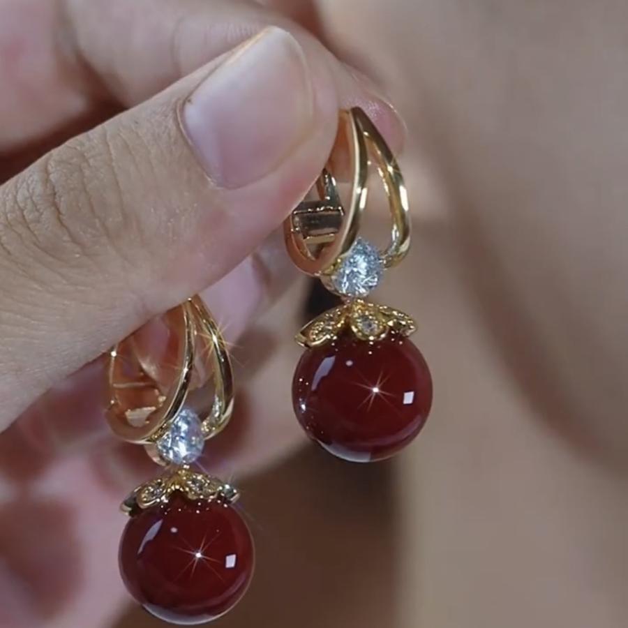 法式轻奢高级感红色珍珠耳环女时尚设计锆石耳扣精致优雅大气耳饰