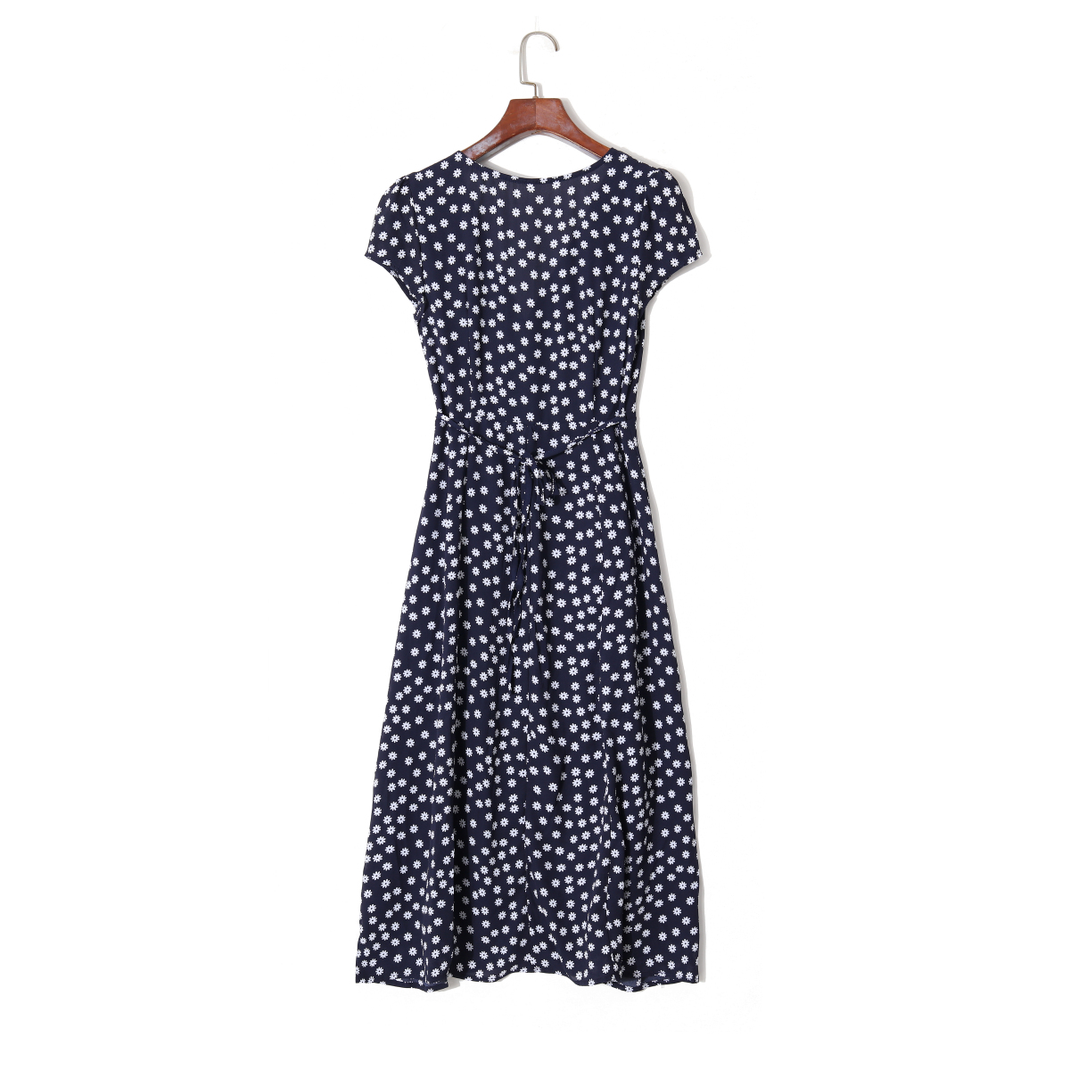 2025夏季女装韩版复古碎花印花V领短袖一片式收腰系带显瘦连衣裙