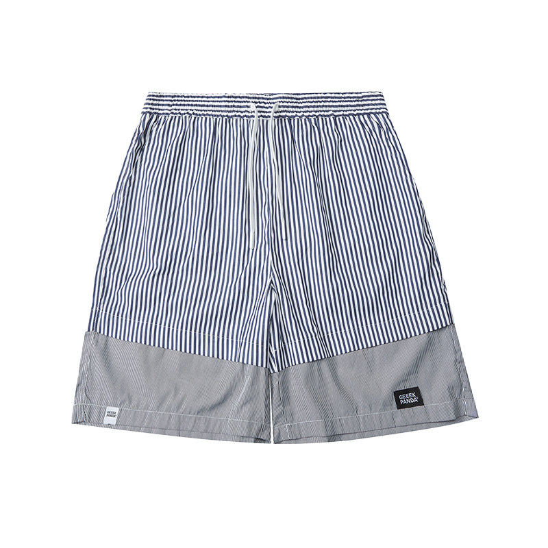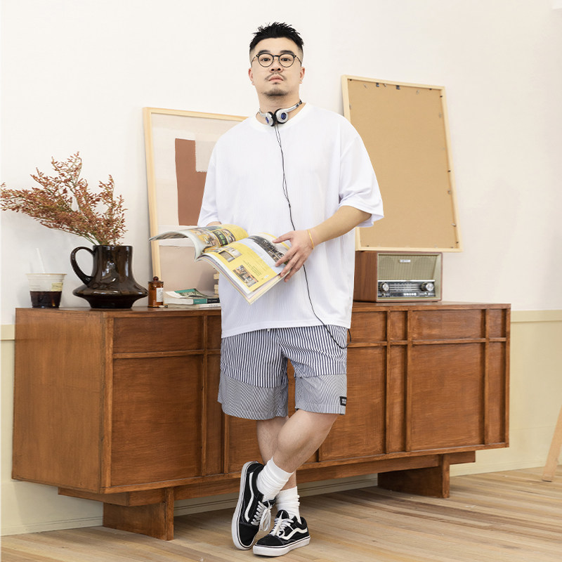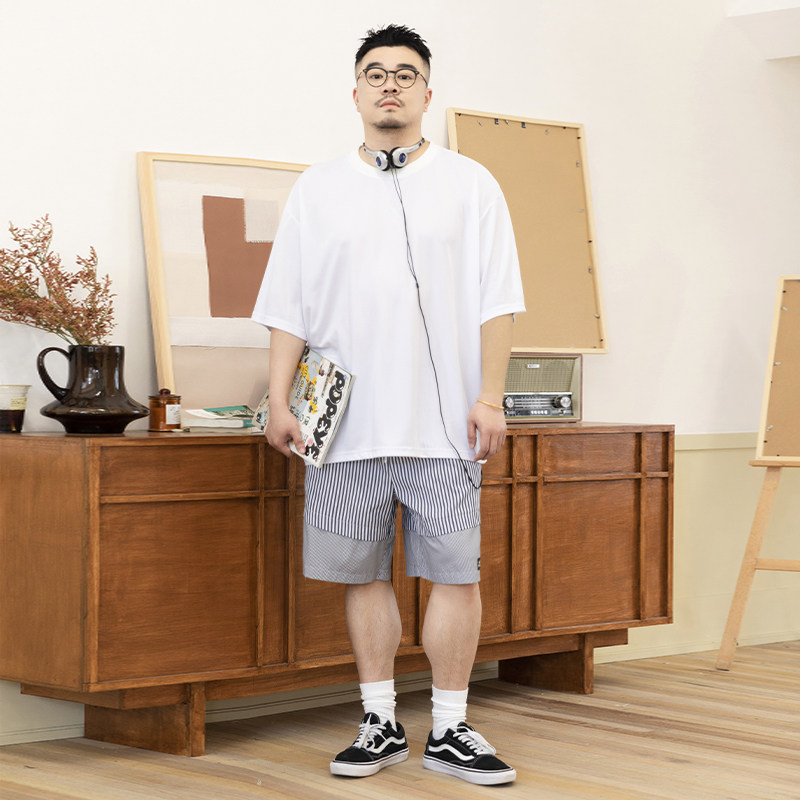 韦恩泽维尔大码拼接条纹短裤男宽松夏季松紧腰轻薄直筒五分裤8724