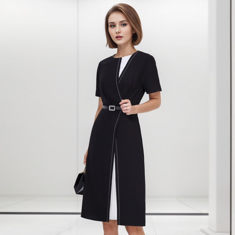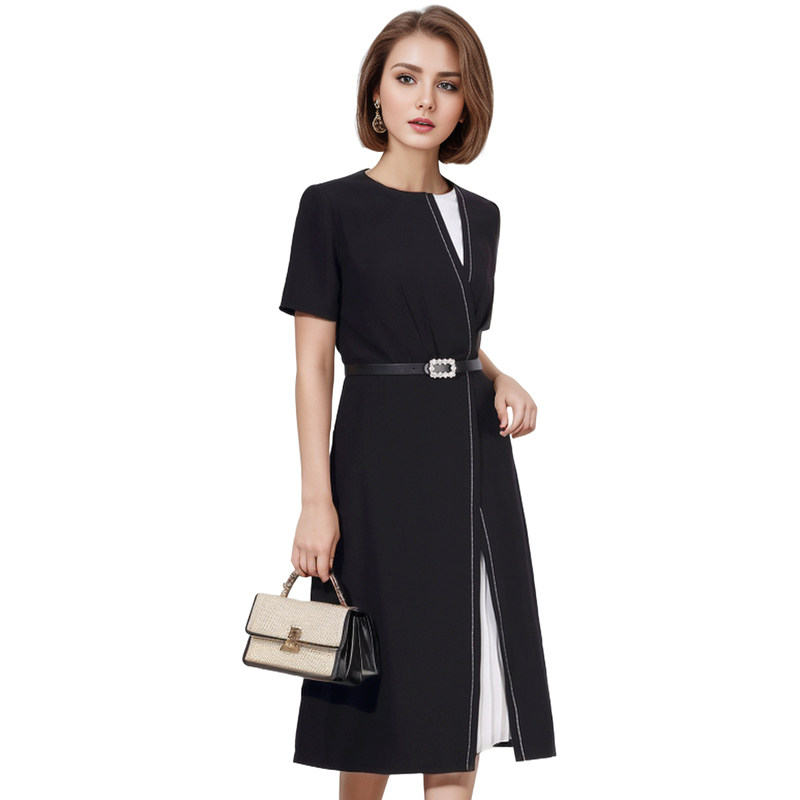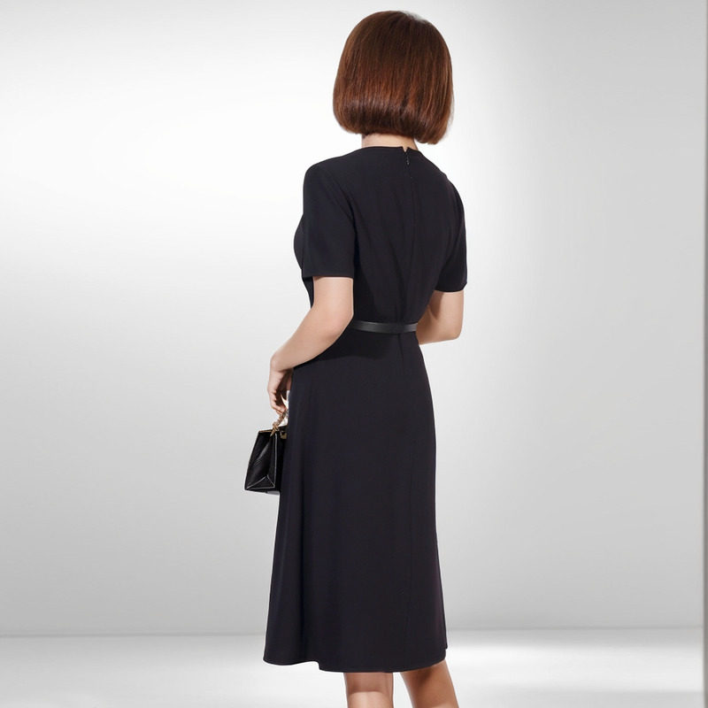 【雅致】璐丝百丽时尚裙子女夏季2026新款黑色A字短袖圆领连衣裙