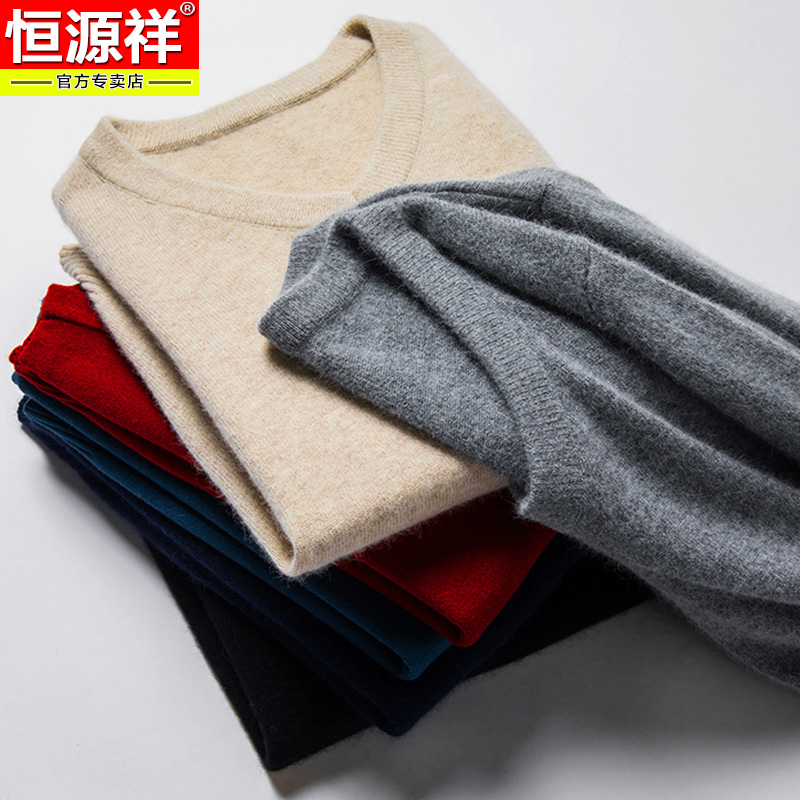恒源祥羊毛衫男100纯羊毛V领针织衫冬季加厚鸡心领打底衫羊绒毛衣