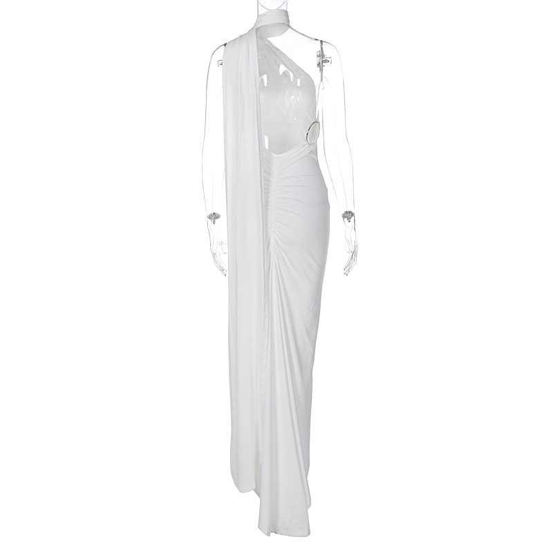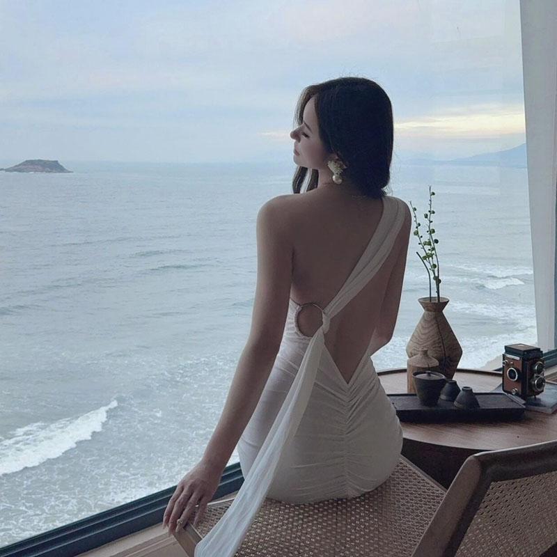 海边度假沙滩裙氛围感飘带挂脖露背斜肩法式白色年会礼服拖地长裙