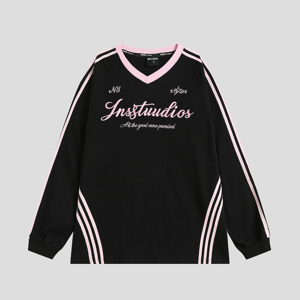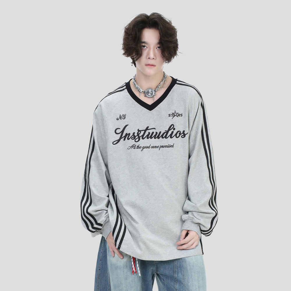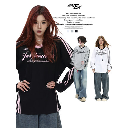 AMES 潮牌国潮美式「三条杠撞色拼接」V领长袖宽松休闲T恤男女