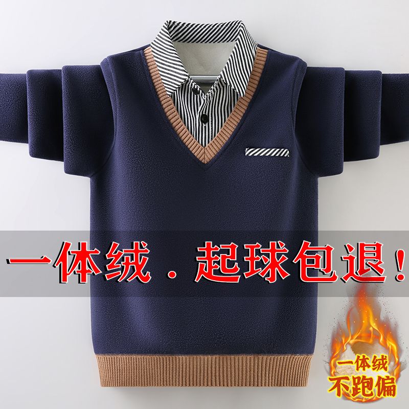 童装男童毛衣假两件秋冬款新款中大童加绒加厚针织打底衫套头学生