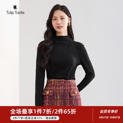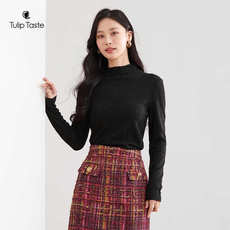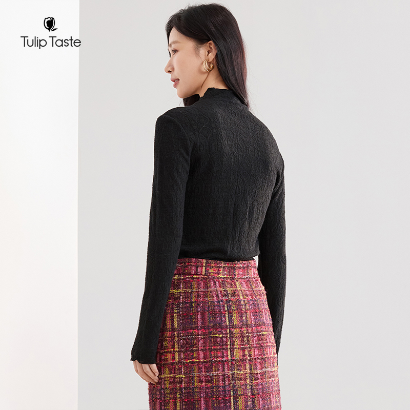郁香菲半高领针织衫女气质通勤秋季时尚提花修身套头打底衫上衣