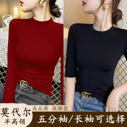 莫代尔t恤女长袖半高领打底衫内搭冬五分袖大码春秋薄款纯色上衣
