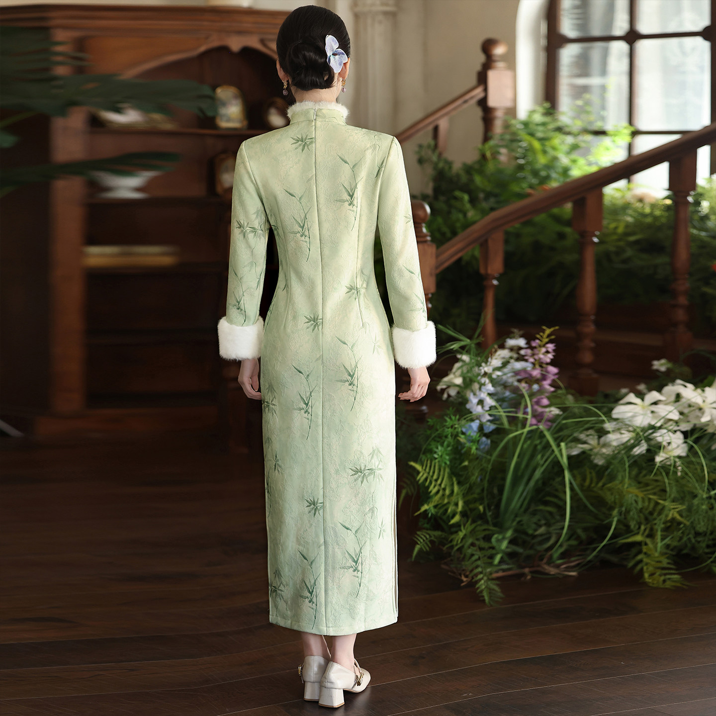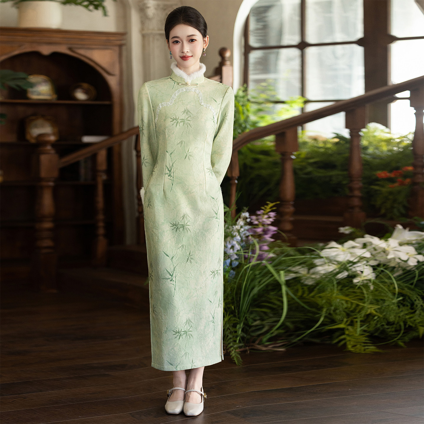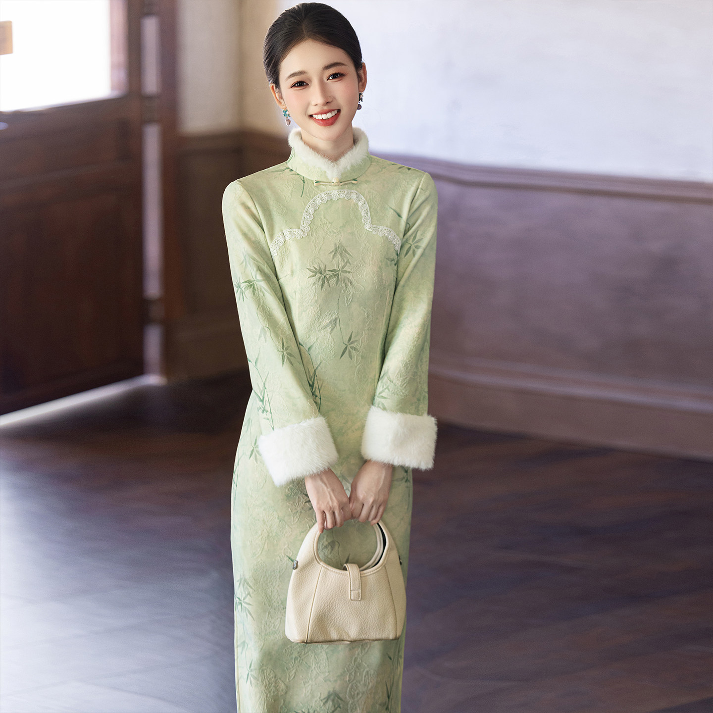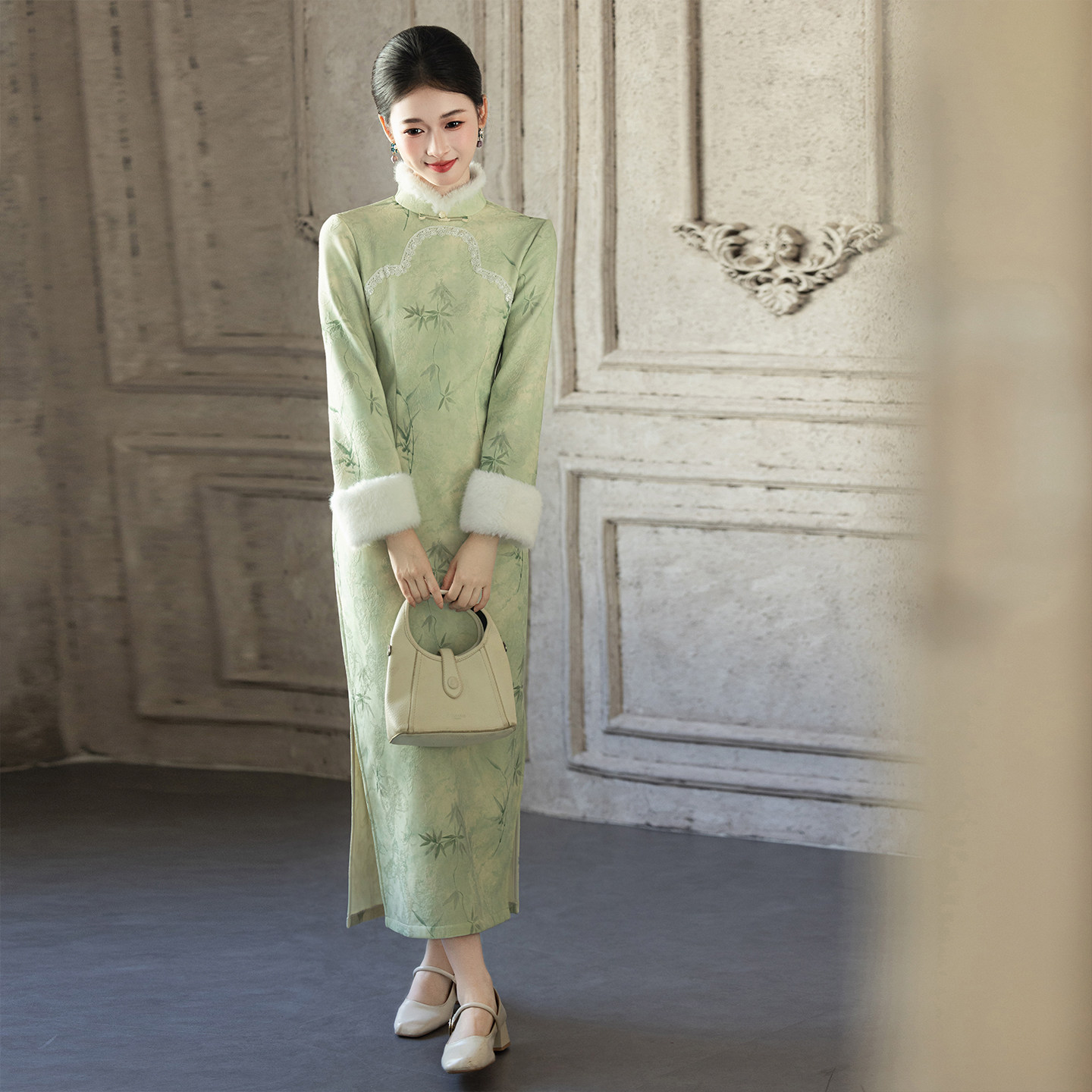 旗袍2025新款秋冬季高端气质优雅修身显瘦加绒加厚长袖保暖女绿色
