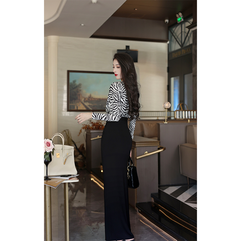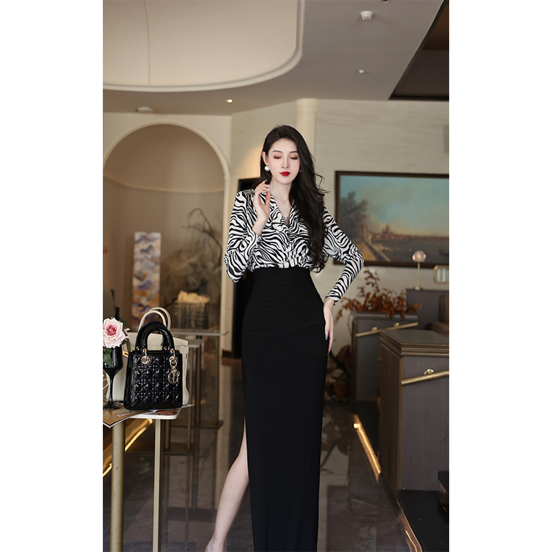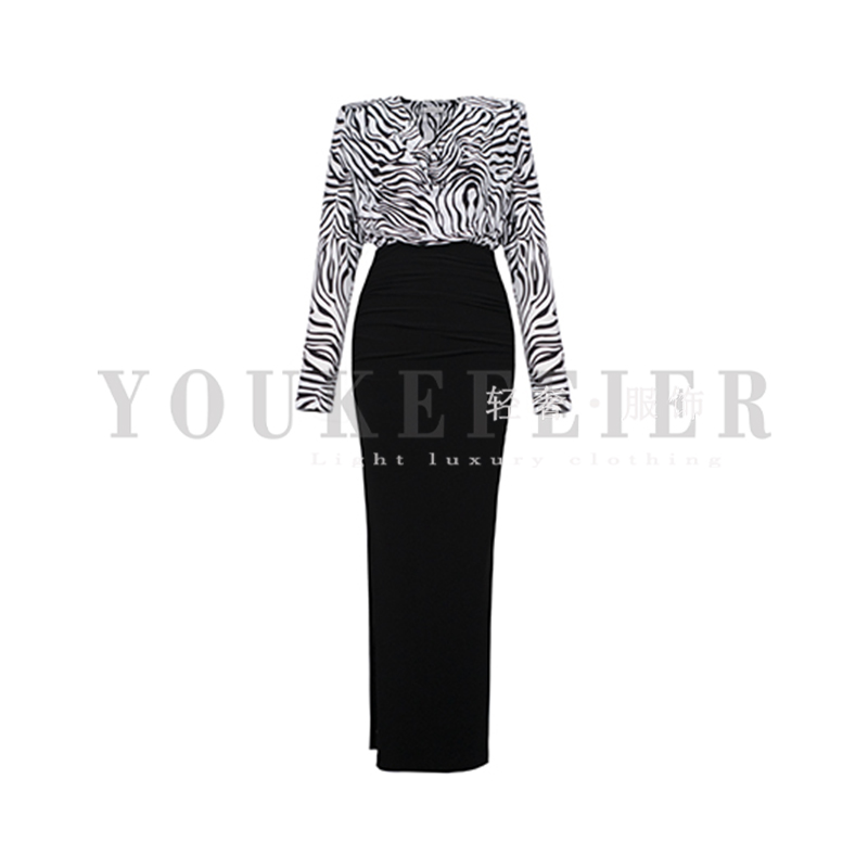 YOUKEFEIER原创设计高定水晶麻印花斑马纹黑色假两件女士连衣裙