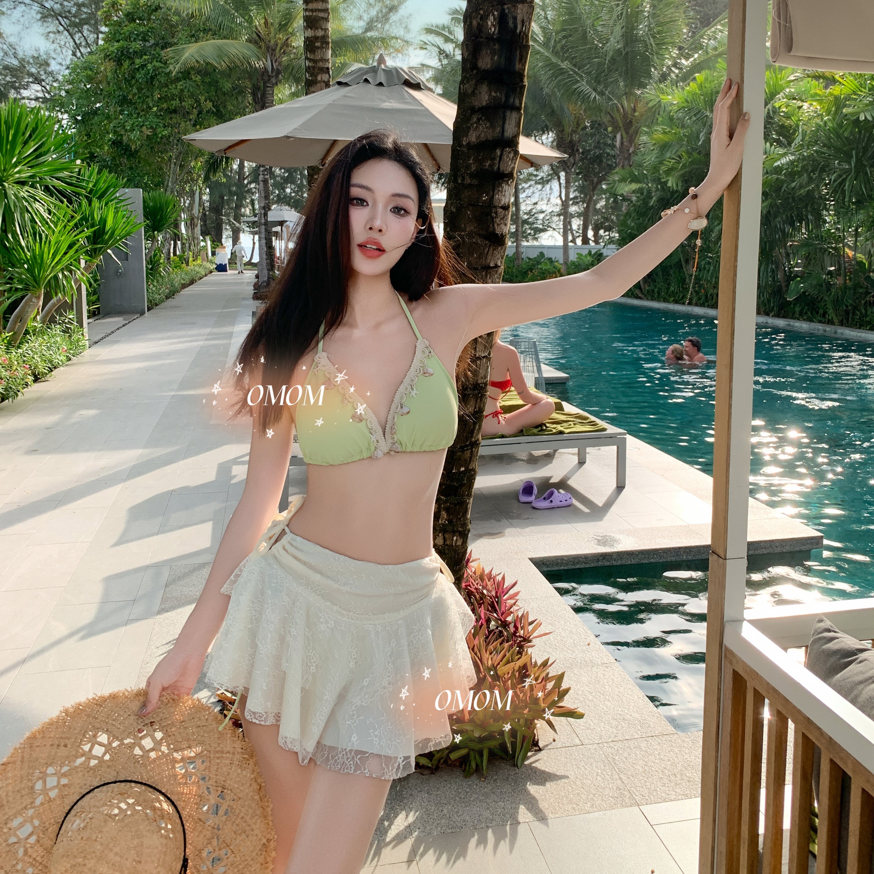 omom2025新款清新少女感bikini三件套纯欲性感海岛度假泡温泉泳装