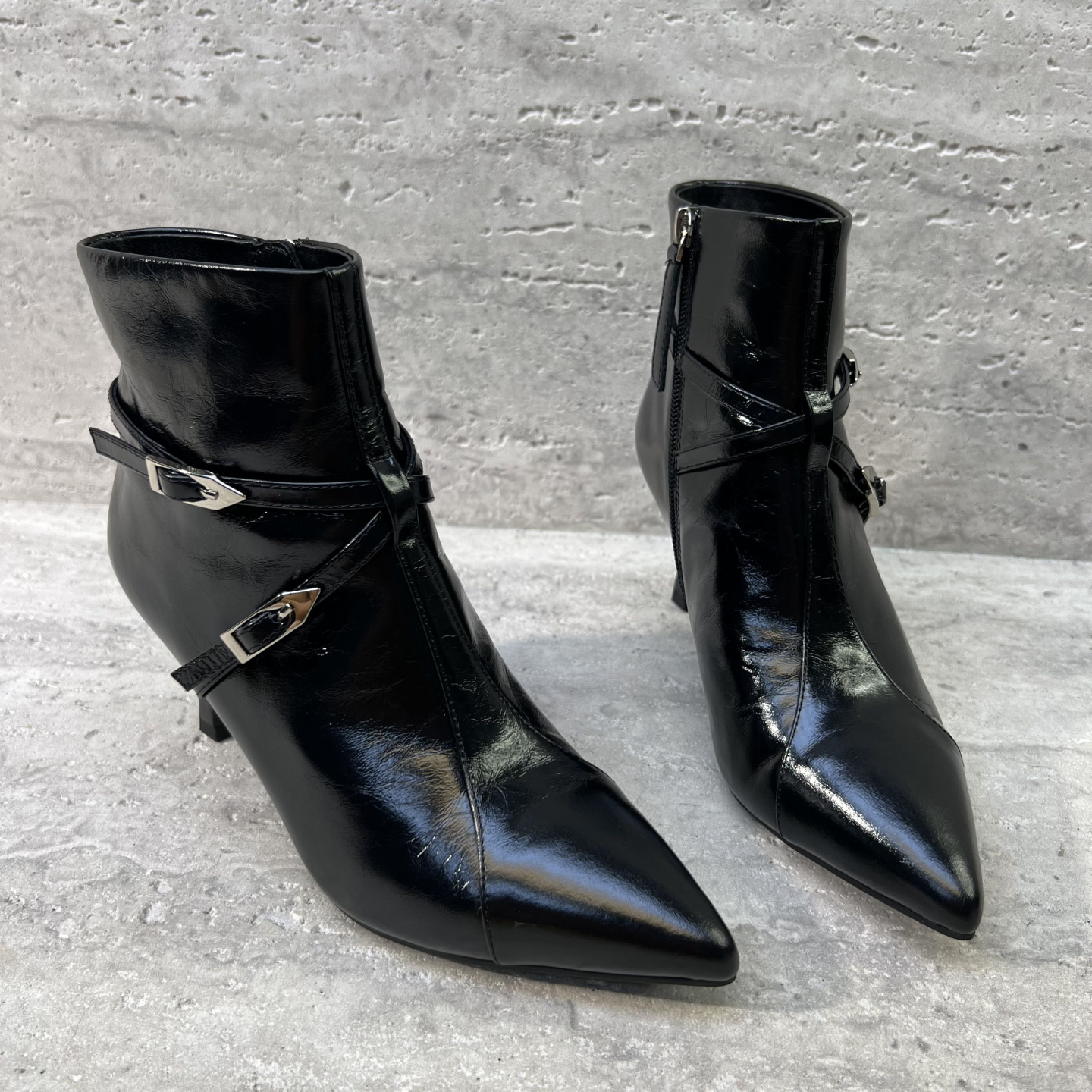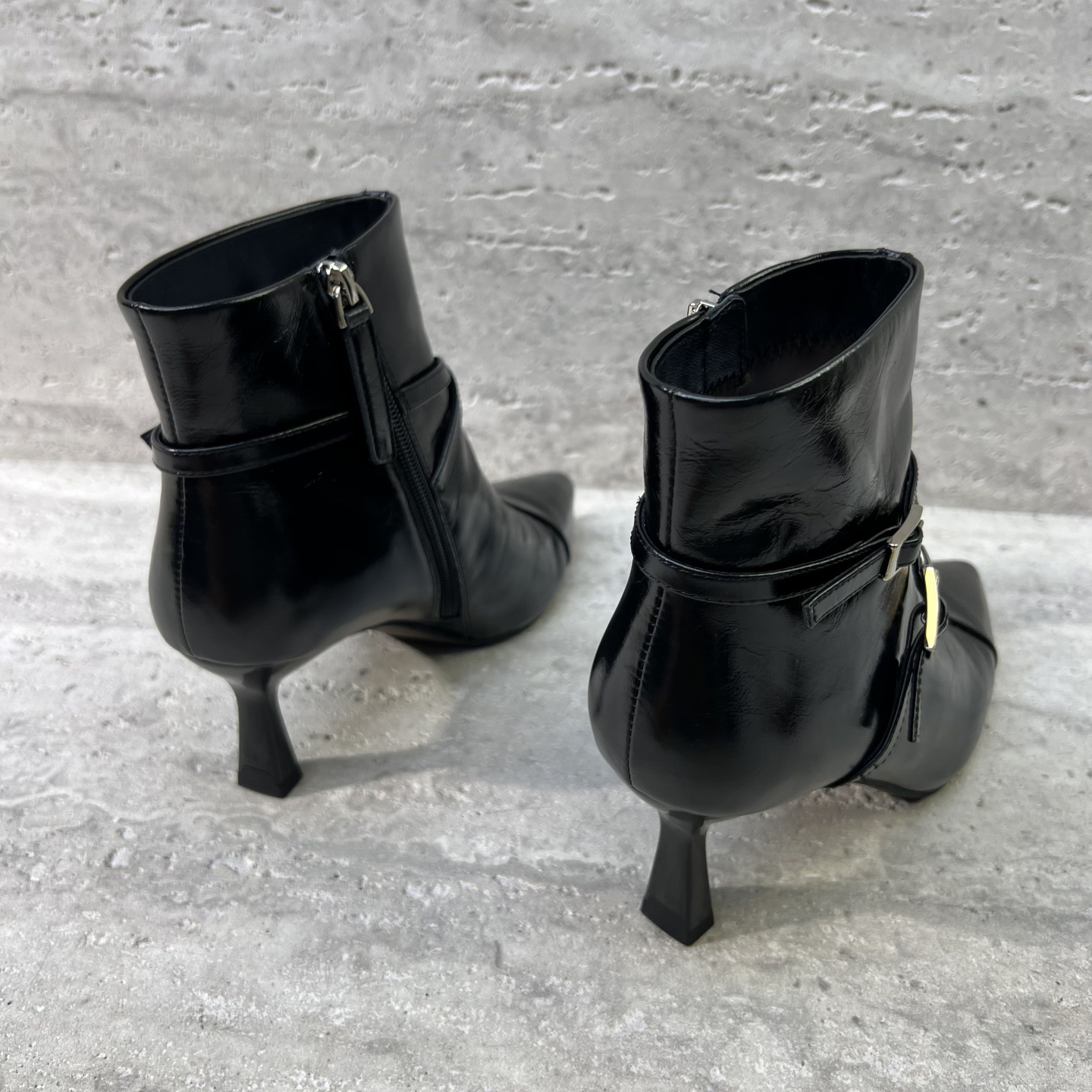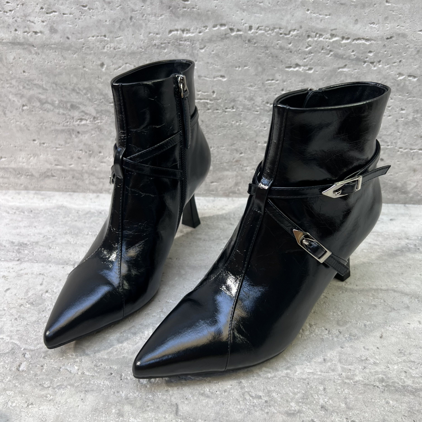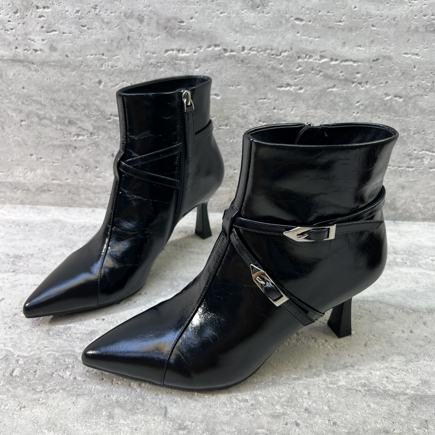 尖头细跟皮带扣侧拉链高跟鞋短靴
