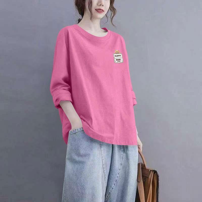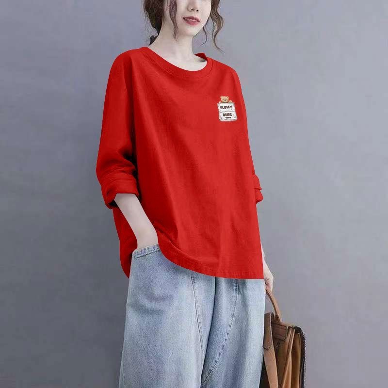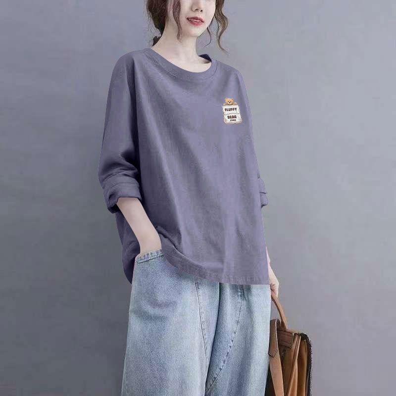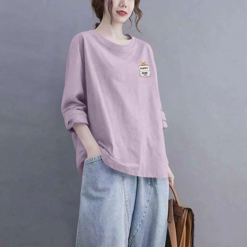 100%纯棉春秋新款长袖印花T恤女韩版洋气通勤百搭宽松遮肉上衣服