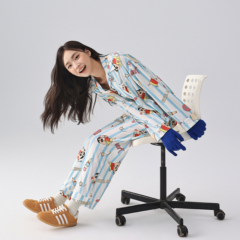 亲嘴猫【蜡笔小新联名】卡通长袖睡衣女春秋季翻领家居服套装外穿