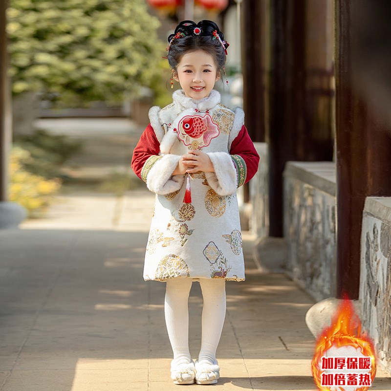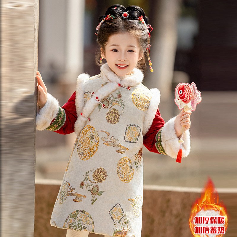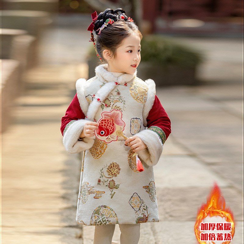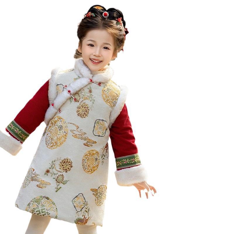 女童加厚新中式国风马甲改良旗袍连衣裙套装冬款新年穿搭汉服