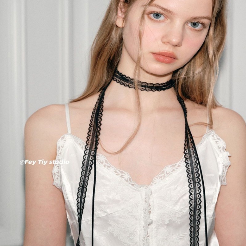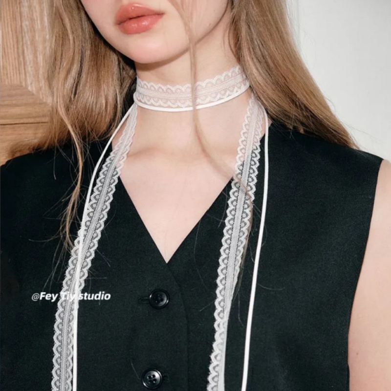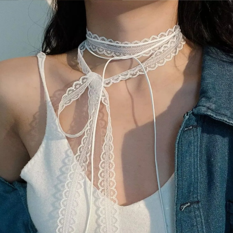 叠戴层次感设计白色蕾丝飘带女春夏百搭细窄长条丝巾锁骨颈带项链