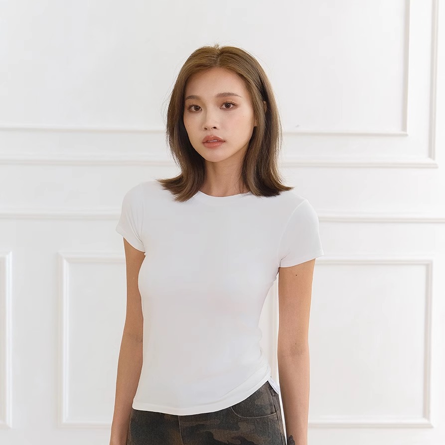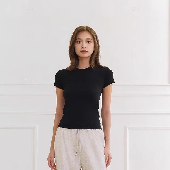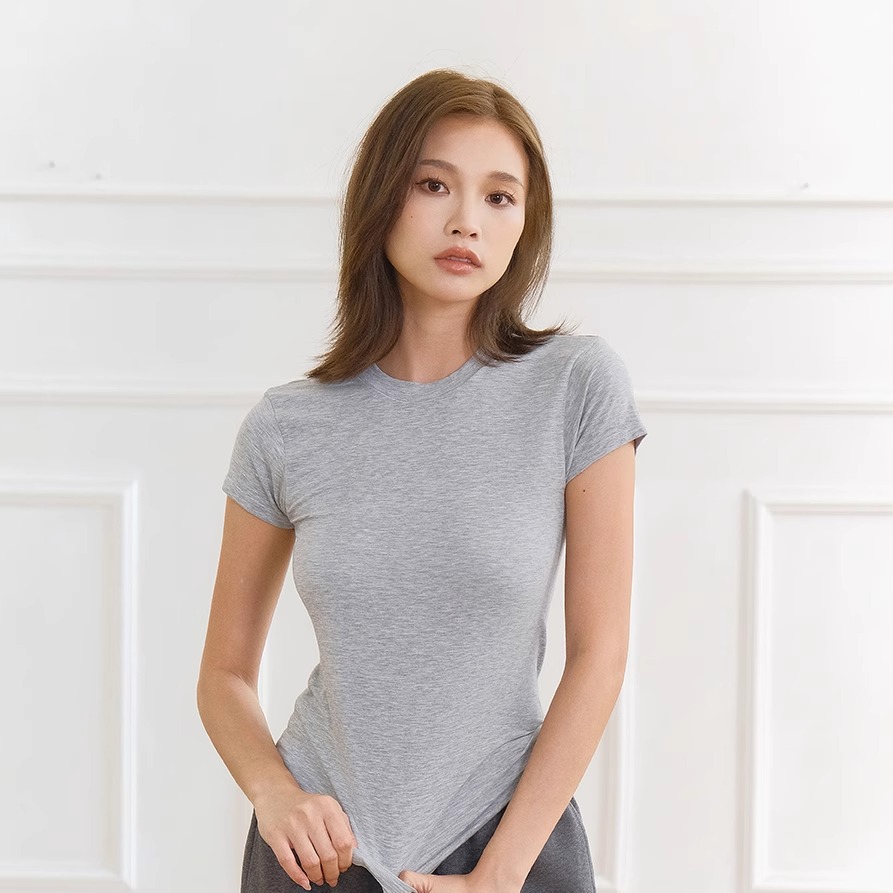 11E 正肩紧身灰色运动短袖圆领T恤女夏季短款修身显瘦打底上衣