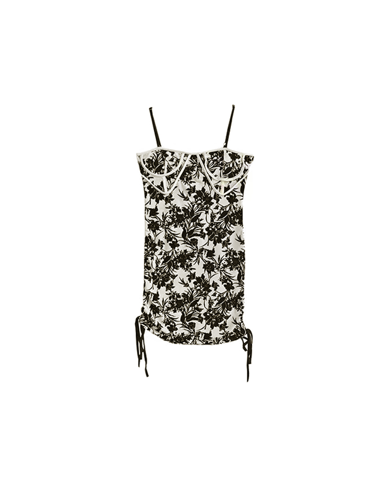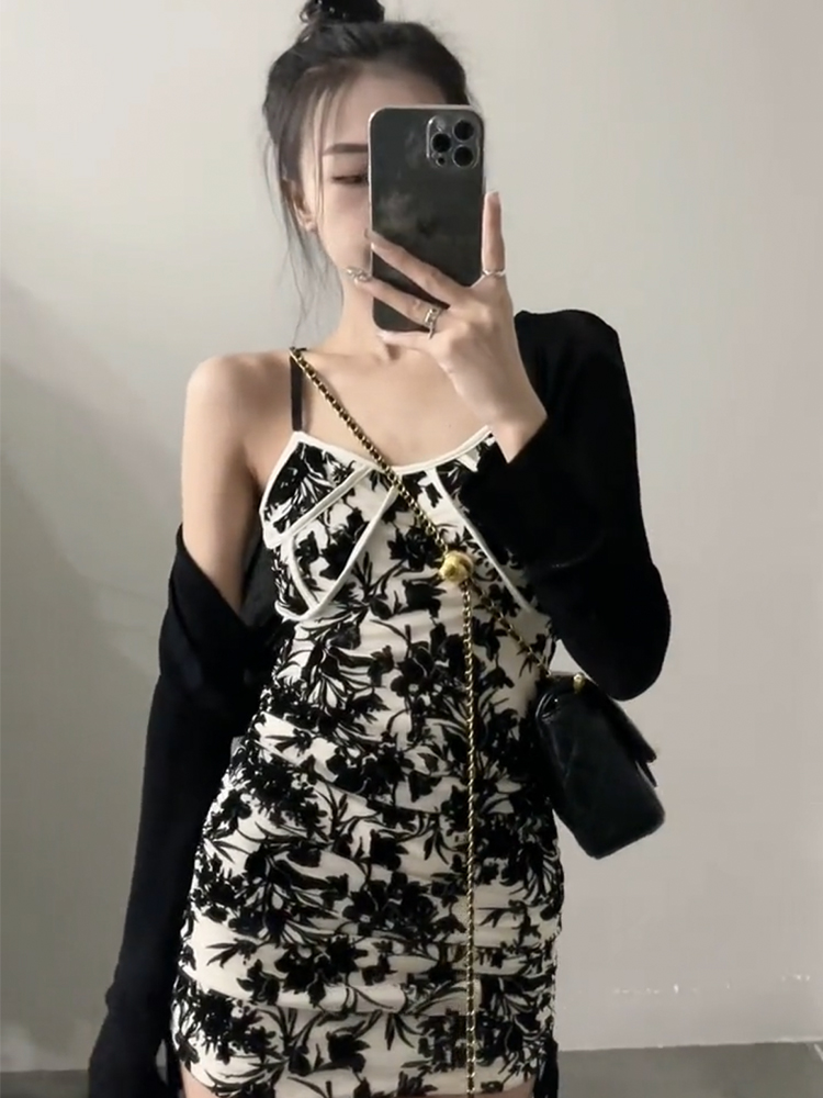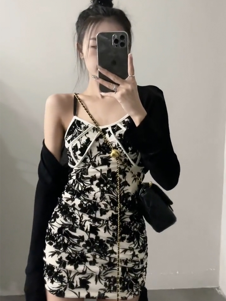 纯欲风气质黑白碎花吊带背心裙女2024夏季韩版外穿抽绳包臀连衣裙