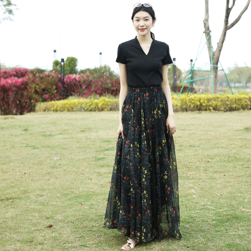 半身裙女夏新款碎花雪纺a字高腰显瘦大码长款气质仙女大摆裙子